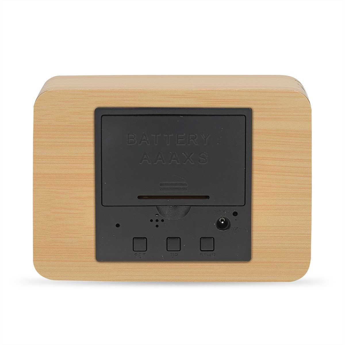 • Small wooden digital alarm clock with date and thermometer