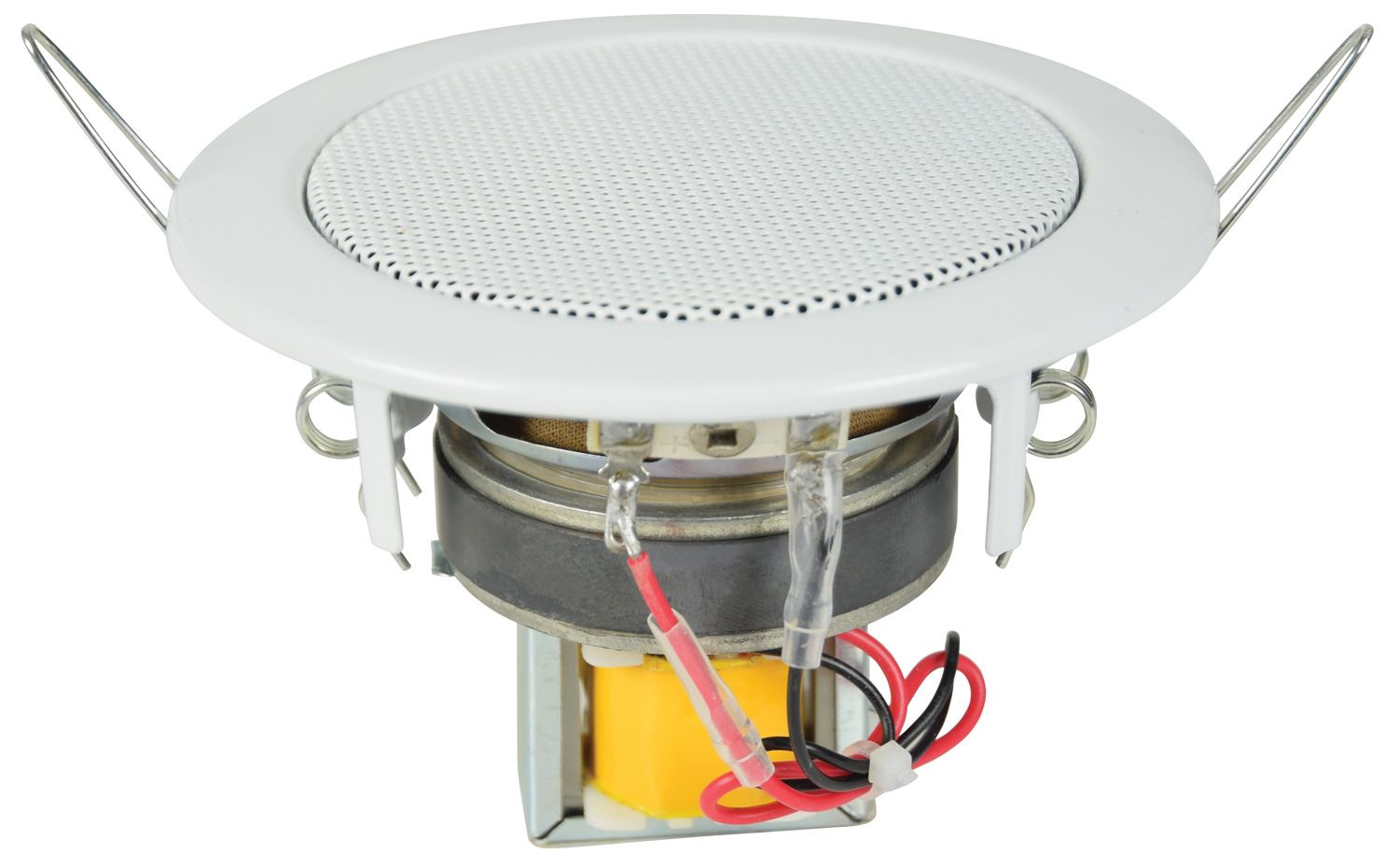 Miniature ceiling speaker with metal frame and spring retainers for flush-mounting into ceilings or walls. Fitted with a 100V transformer with tappings for 3W or 6W output and a 3" paper cone which is treated with a water-resistant coating to enable installation in wet areas, such as washrooms or food preparation areas.