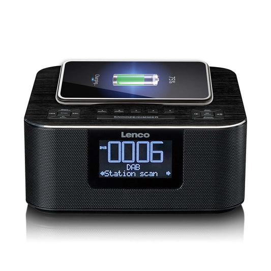 Lenco DAB+ FM Alarm Clock Radio with USB and Qi Wireless Smartphone Charging Pad | Black