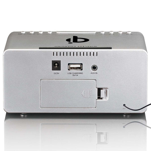 Lenco FM Alarm Clock Radio with USB and Qi Wireless Smartphone Charging Pad | Black & Silver