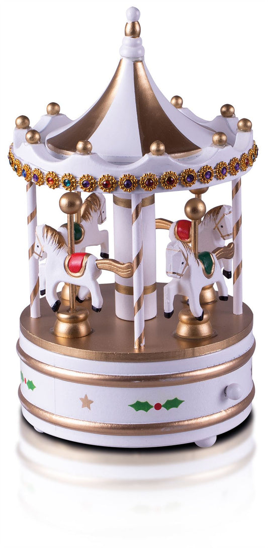 Christmas Wooden Mechanical Carousel Music Box Wind Up Ornament - White & Gold