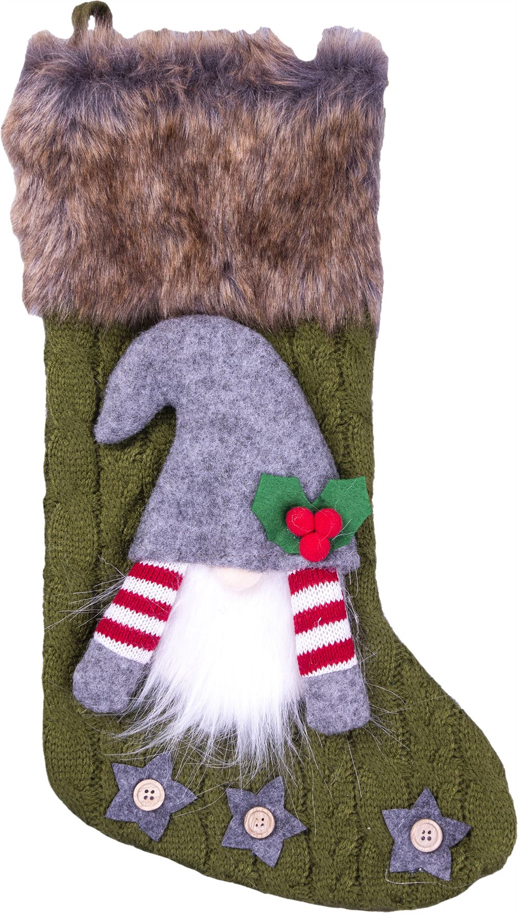 This super luxurious stocking is on a whole other level, beautifully knitted with a fur lined trim featuring a felt and wool gonk with a white bushy beard. Large enough in size to fit in all those little Christmas surprises. Simply hang from fireplaces or staircases using the integral felt hook. Young and old will love these beautifully designed stockings.