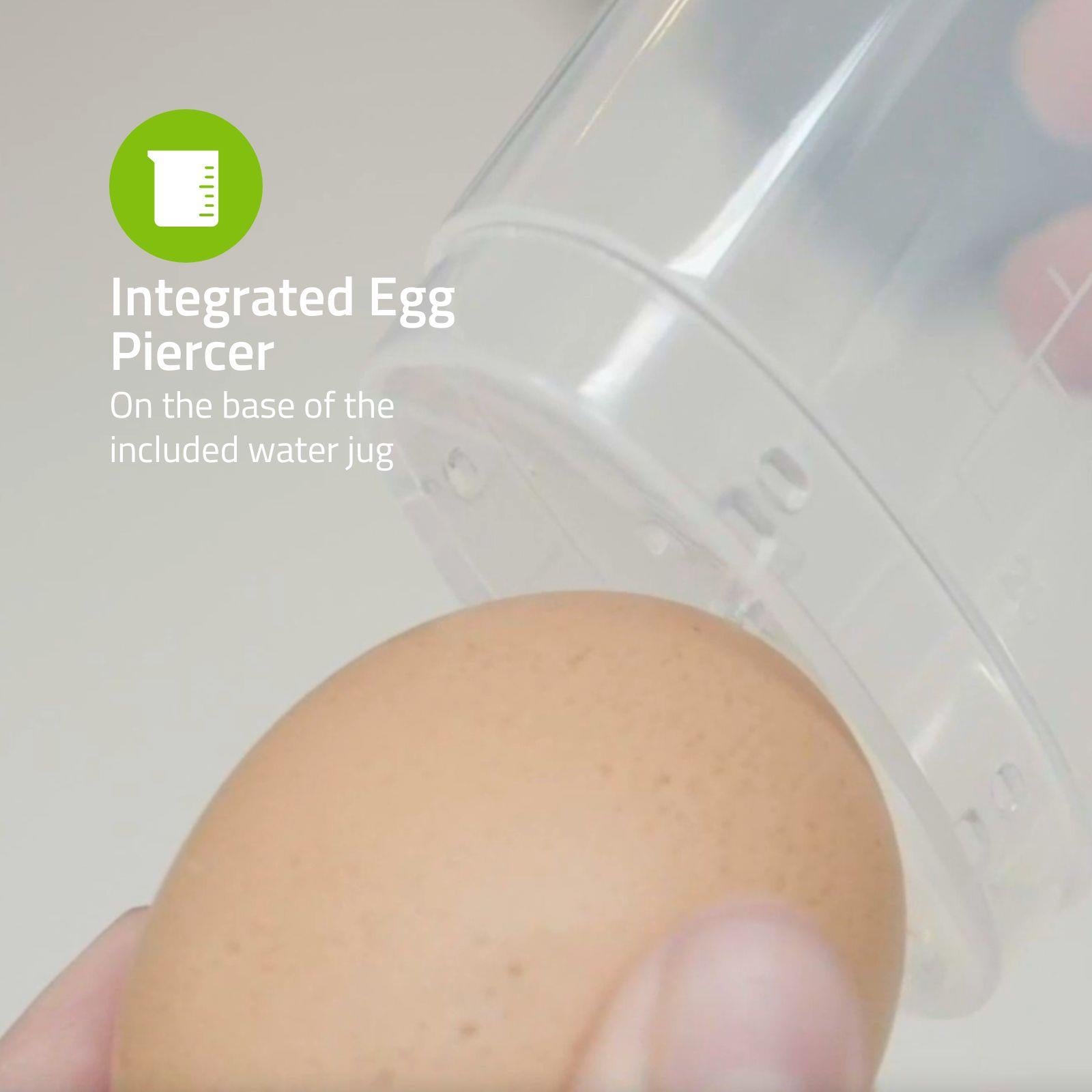Simply add the right amount of water with the included jug. Poke a hole in each egg with the integrated egg piercer on the back of the jug so they won’t crack during cooking.
