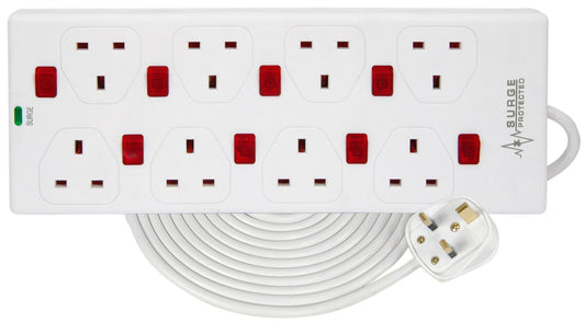 Mercury 8 Gang Extension Cable with Surge Protection & Neon Switches | 2 Metre Cable, White