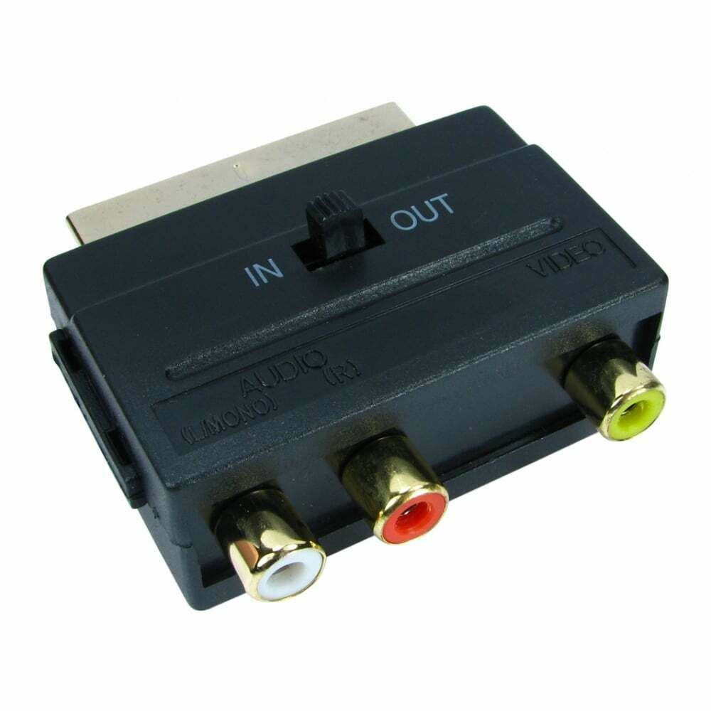 SCART adapter with left/right audio female RCA ports and composite video female port, with input/output switch giving you control over signal direction. Gold connectors for a higher quality finish while providing anti-corrosive properties.