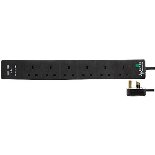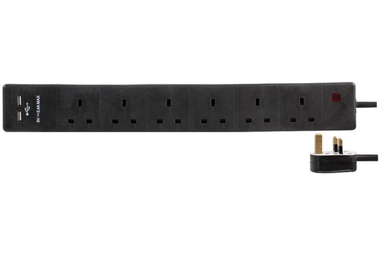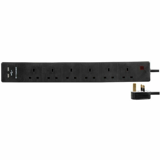 6 Gang 2m Mains Extension Lead Socket Surge Protected 13A with USB Charge Ports - Black