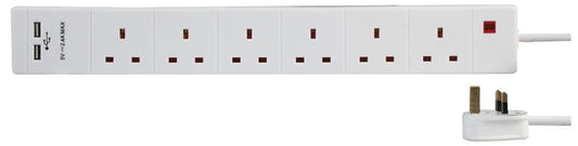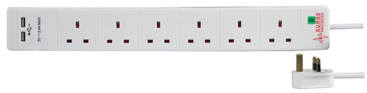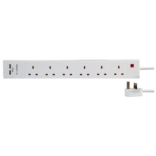 6 Gang 2m Mains Extension Lead Socket Surge Protected 13A with USB Charge Ports - White