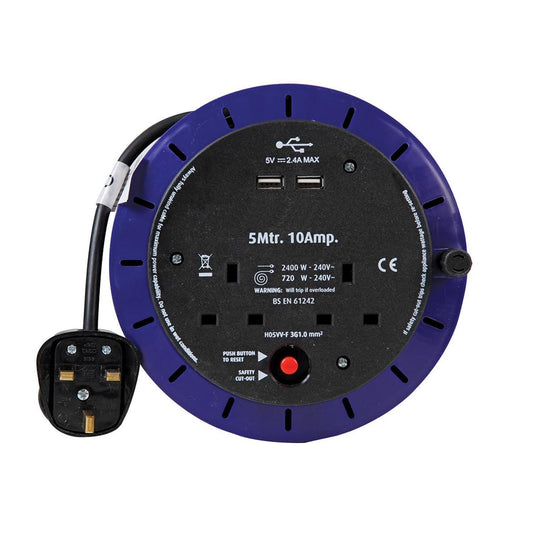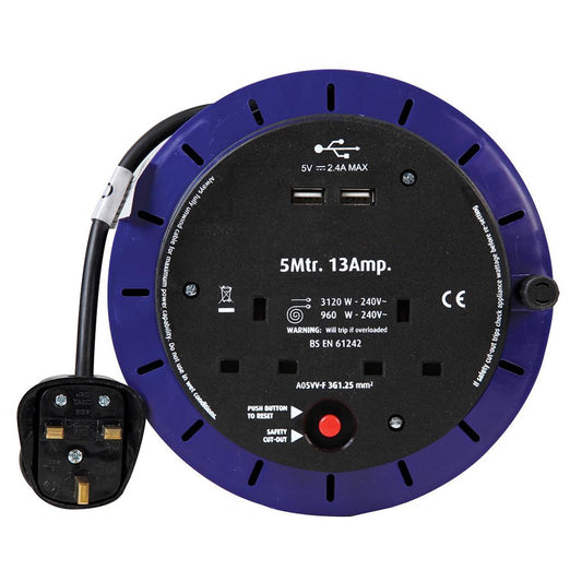 6 Gang 5m Mains Extension Lead Socket Surge Protected 13A with USB Charge Ports - White