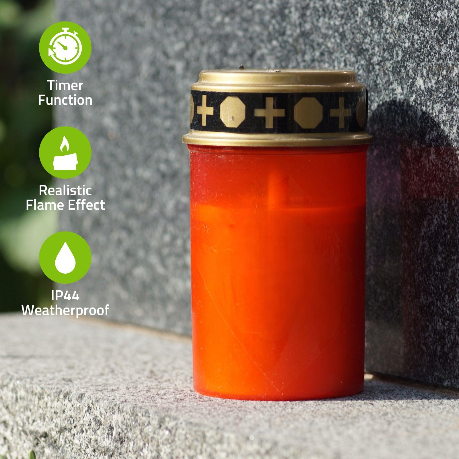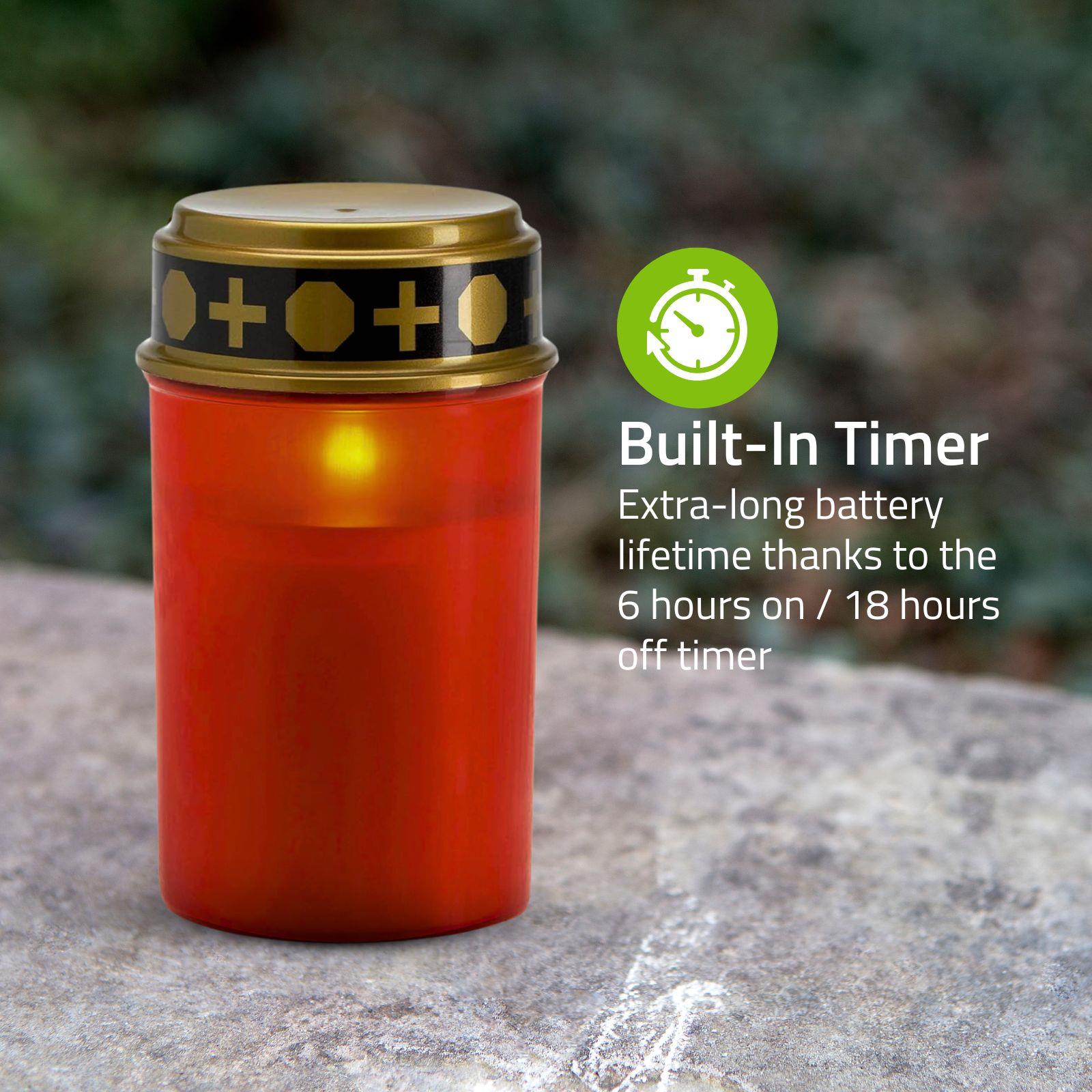 Remember your loved ones with this Nedis LED grave light. The energy efficient LED ensures a realistic flame effect. For even more efficiency the grave light is equipped with a 6 hours on/18 hours off timer, which enables an extra-long battery life time of up to 45 days*.