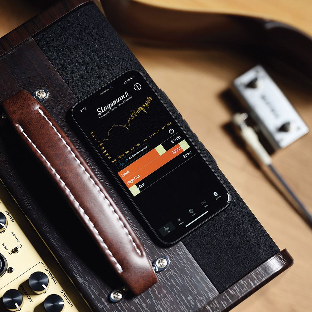 Stageman II AC-80 is a unique and comprehensive amplifier and vocal PA for acoustic guitarists. Mains or internal rechargeable battery operation offer freedom and flexibility for performance anywhere. The 80W amplifier drives a custom 6.5" woofer paired with a 1" tweeter for a powerful full-range output. Independent channels for guitar and microphone are conveniently positioned on the top panel for the angled cabinet, each with controls for gain, 3-band EQ, effects and reverb. Deeper editing and extra features like Impulse Response profiles are accessible via Bluetooth using the free-to-download Stageman mobile app. Bluetooth can also be used for audio streaming of tracks to play along with. An internal looper, drum machine and effects can be edited in the Stageman app and triggered from foot switches connected at the rear panel. Aux input, send/return loop, line output and DI output complete the rear panel audio connections with a USB port for firmware updates. In summary, Stageman may be the acoustic amplifier to satisfy almost any performance situation.