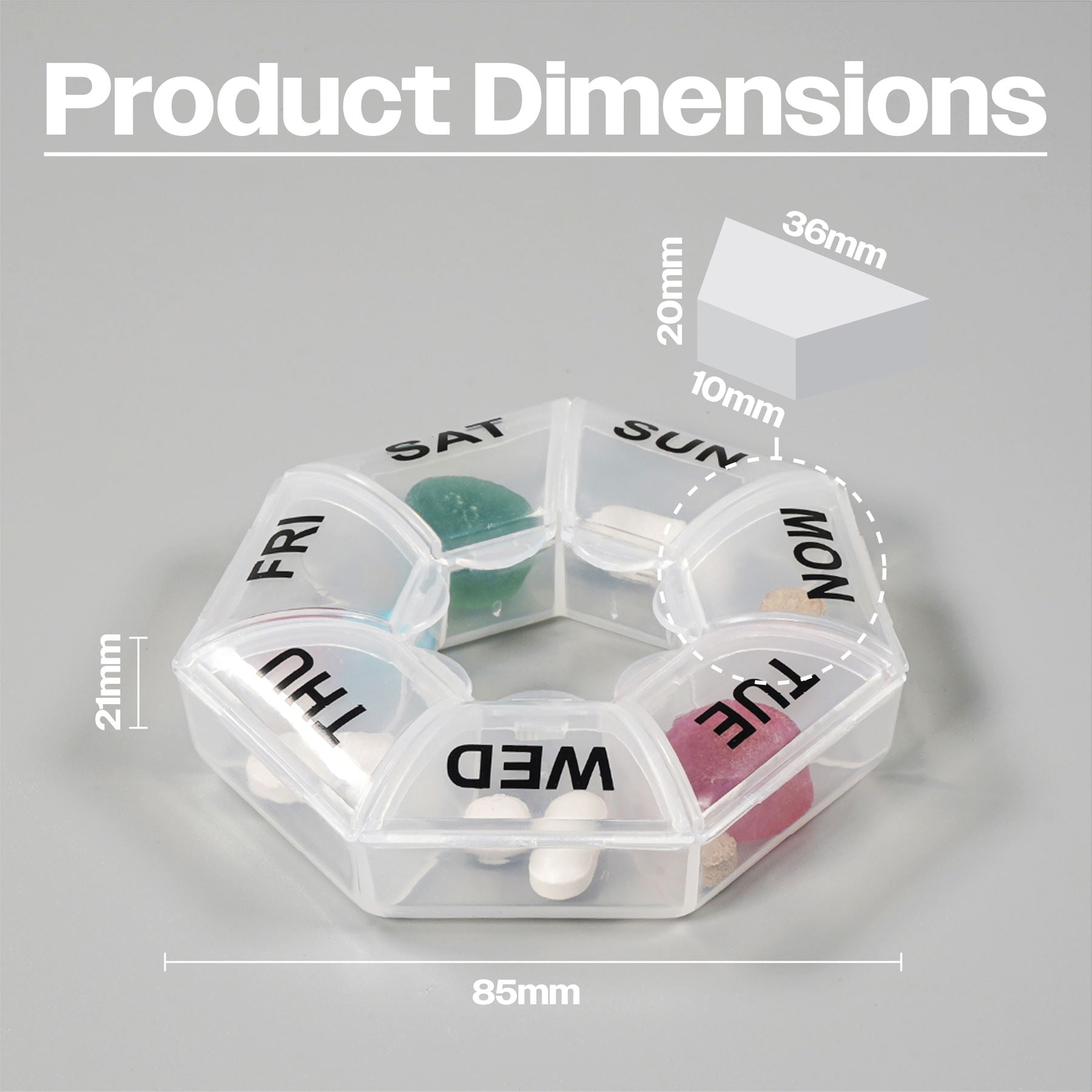 EASY TO USE; Simple flip up lids, ideal for those with arthritis or weakened grip power PEACE OF MIND; Organise your medication needs for the week ahead easily LARGE CAPACITY; Generous compartment sizes. Will hold several pills per container SAFE; Lids click down firmly to avoid spillages when in transit. BPA Free PORTABLE; Handy to fit in a bag when travelling