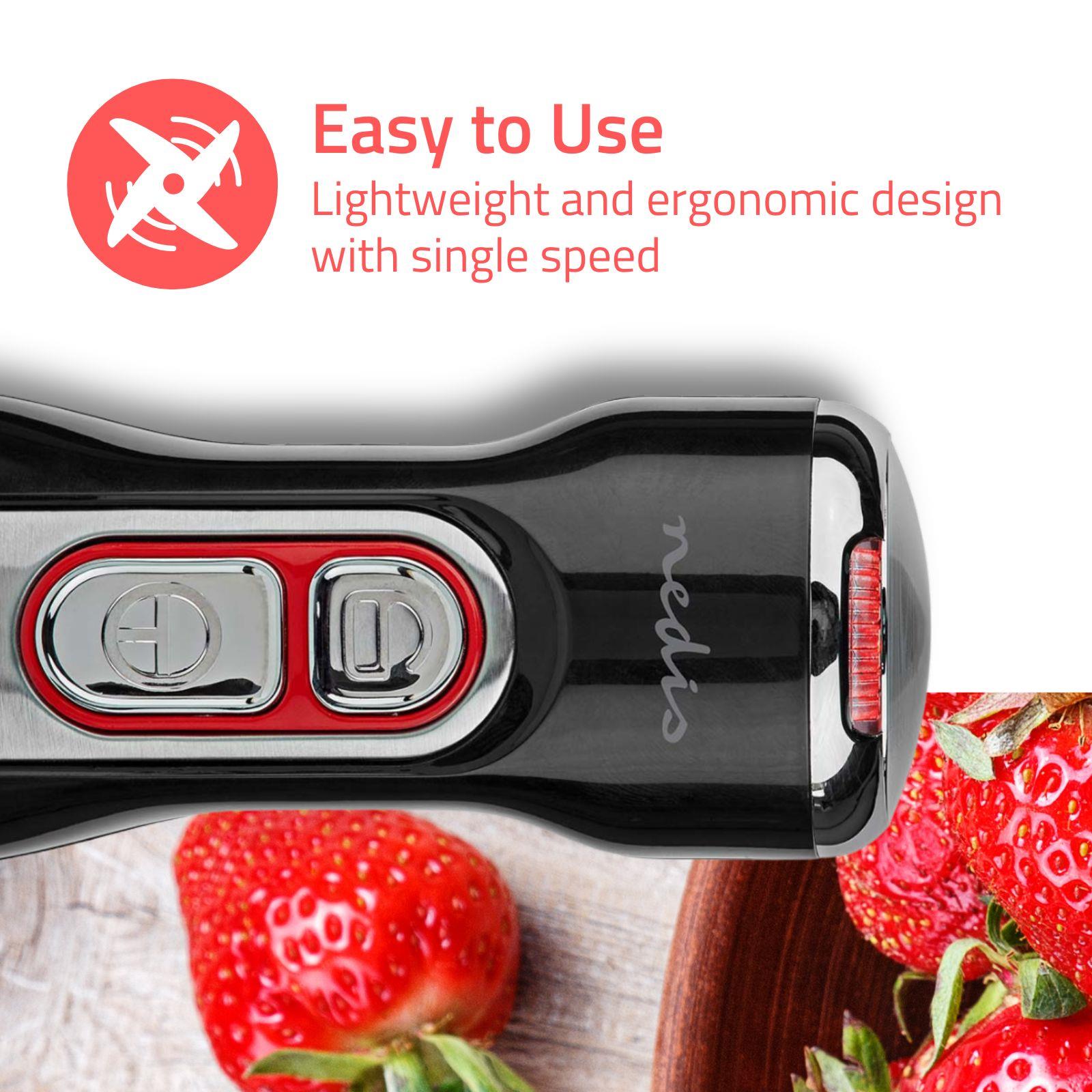 This Nedis cordless hand blender gives you maximum freedom of movement. Ideal to make soups, milkshakes, sauces and other recipes without being tied to a power cord. The sleek and lightweight design is cordless and easy to operate with one hand. The single speed version has a top speed of 13.000 RPMs which ensures silky smooth results.