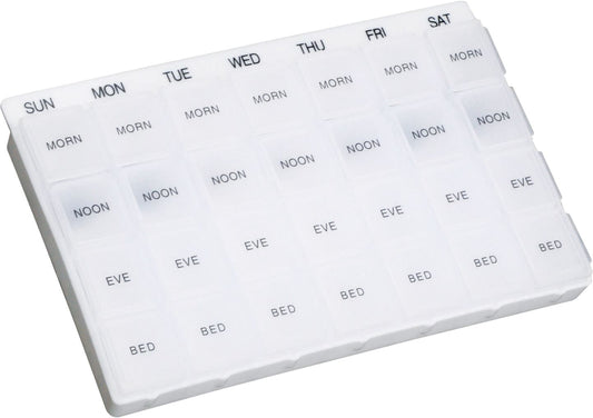 7 Day Weekly Pill Box with 4 Compartments per Day.Supplied in a Clear Clip Shut Case,