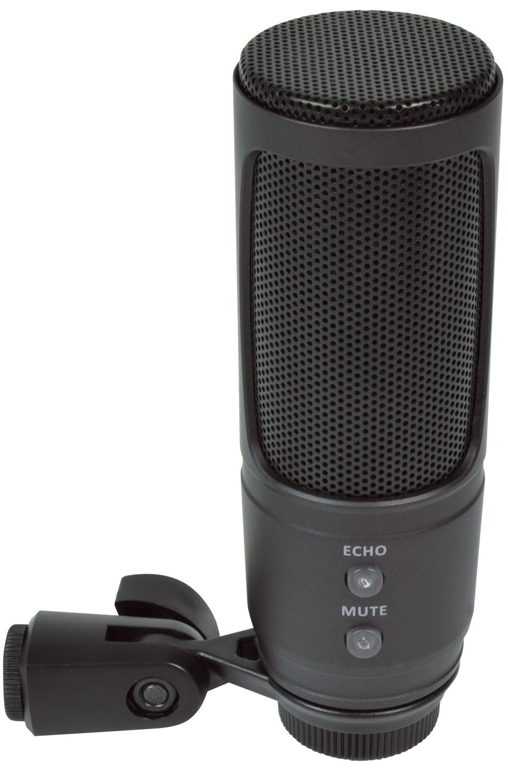 Compact studio condenser microphone for podcasting and vocal recording. Fitted with a back-electret capsule, driven by an onboard preamp. Echo effect and mute function are switchable via 2 illuminated buttons at the front. Connection to a PC or Mac computer is via the supplied USB lead and operates as a plug & play USB audio device. The complete assembly is housed in a black anodised die-cast body with a large steel grille for the capsule. Supplied with a collar clamp and mini tripod for convenient, table-top operation.