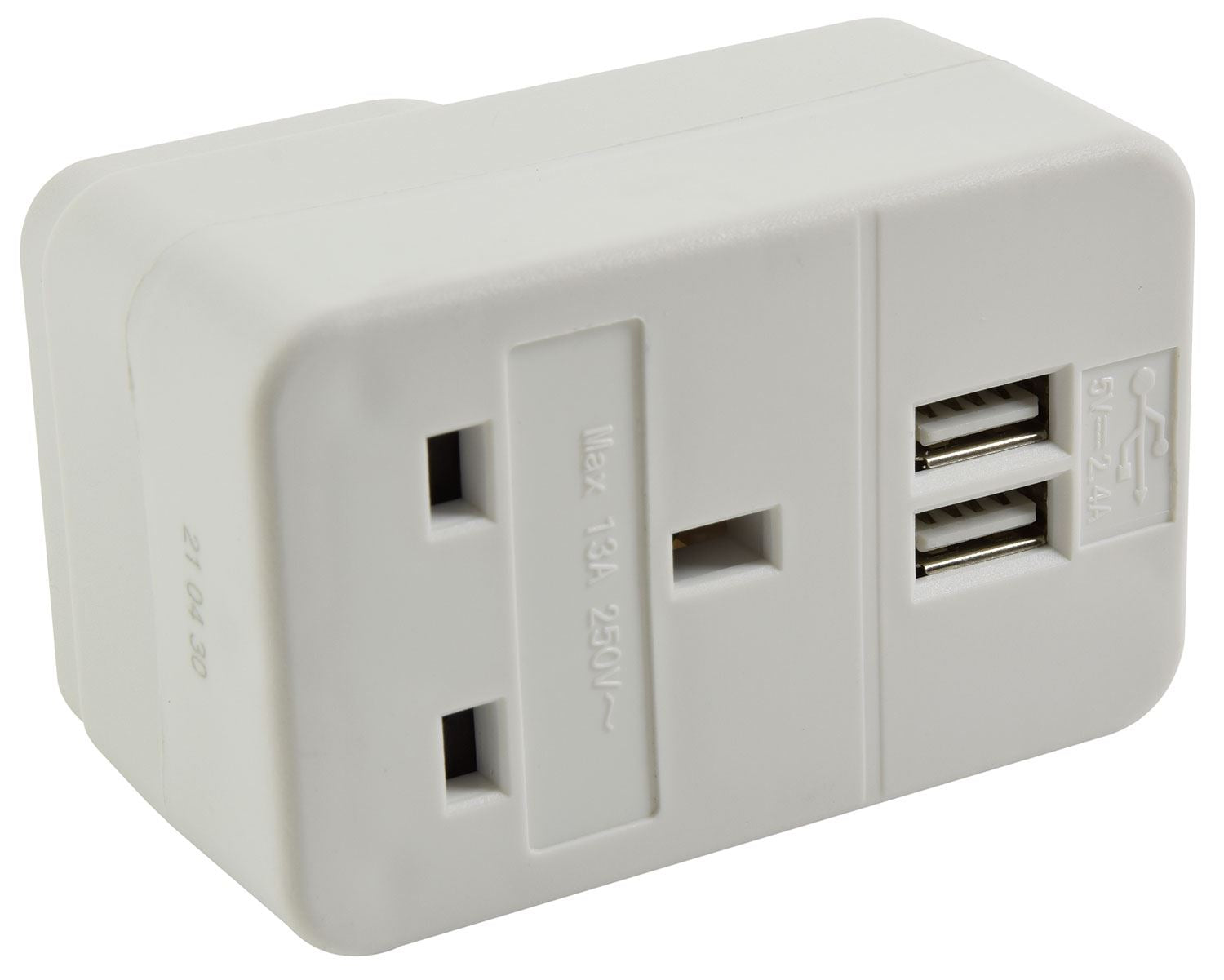 A plug through UK mains adaptor with two USB ports which simply plugs into an existing 13A UK mains socket, adding USB ports for charging portable devices.