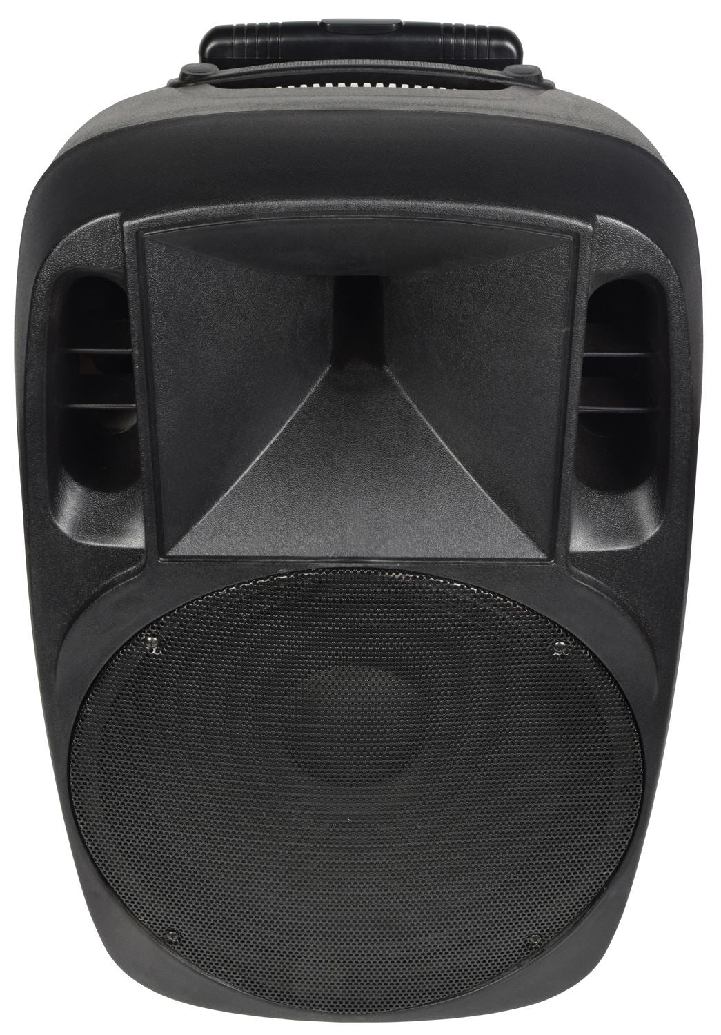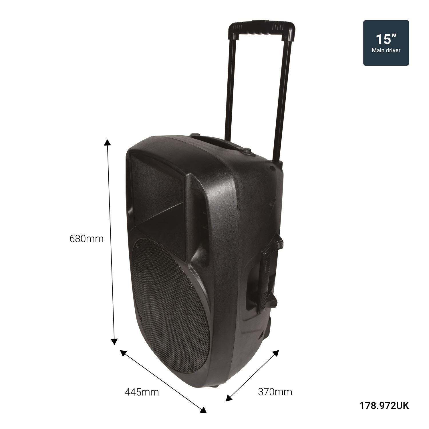 Full range PA speaker in a high impact injection moulded cabinet with integral handles, 35mm pole-mount socket and retractable trolley assembly for easy transportation. The enclosure is loaded with a 4 Ohm heavy duty 15" main driver and titanium compression driver for high frequencies. Designed for general PA duties or as a matching satellite speaker for the high power MIXCAB-15 portable PA unit. XCAB-15 is a full range PA speaker in a high impact injection moulded cabinet with integral handles, 35mm pole-mount socket and retractable trolley assembly for easy transportation. Fitted with a 15" main driver and 2” tweeter for balanced full-range sound delivery. Impedance is 4? to enable maximum power delivery from your amplifier. Designed for general PA duties and ideal as a matching satellite speaker for the high power MIXCAB-15 portable PA unit.