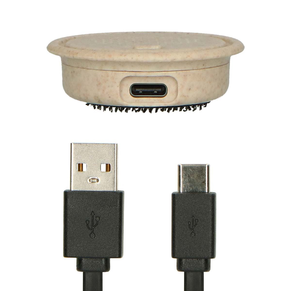 The size of the button and covers have been carefully designed so the risk of swallowing is prevented. The button is charged by a USB-C charging cable, included. When the HeeHee is fully charged, it will only turn on once pressed. This is to prevent the soft toy from ending up in bed with the child while the cable is in use.