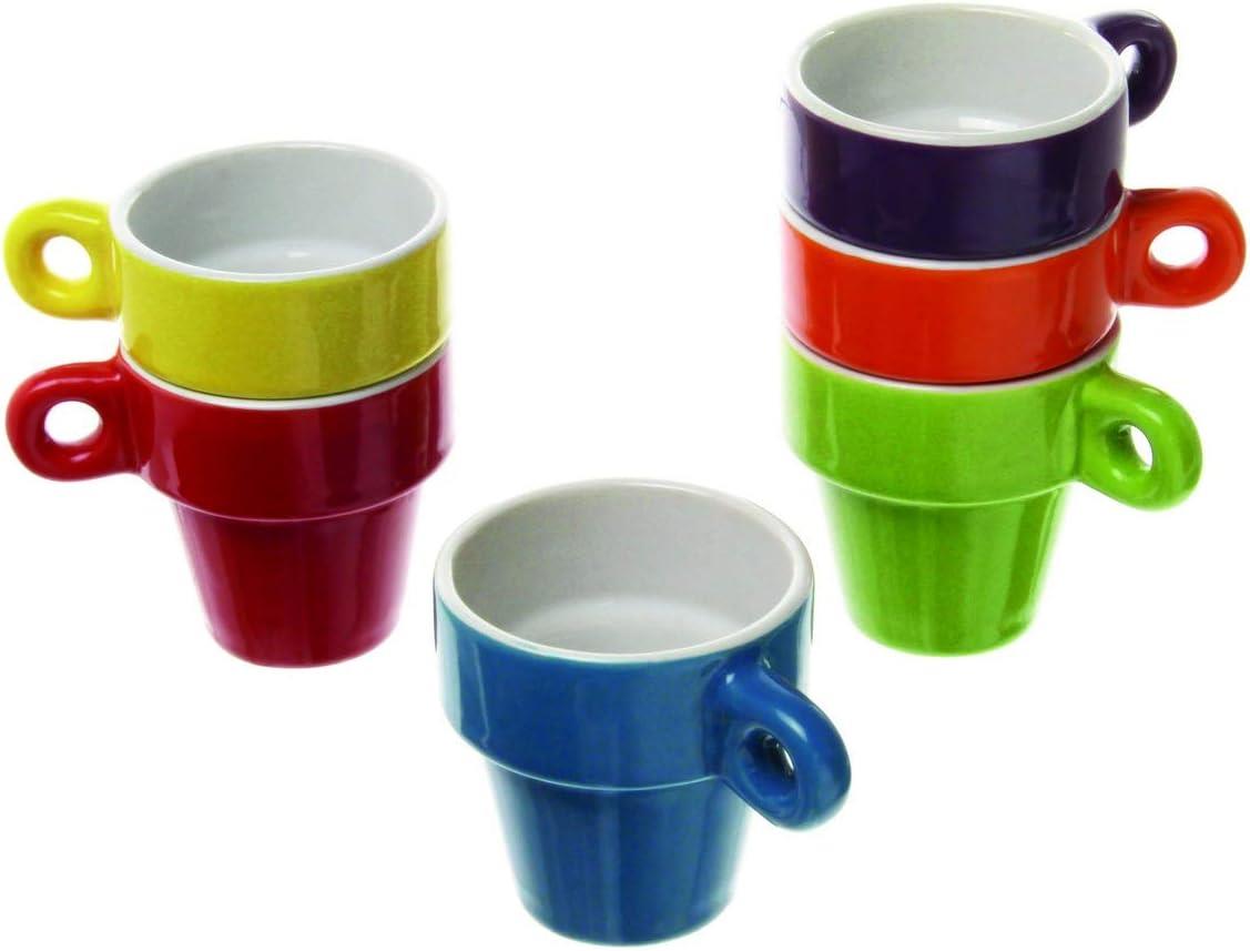 Set of 6 ceramic espresso mugs, perfect size at 5cm diameter. Comes complete with space saving chromed stand Bright attractive design, supplied with a red, orange, yellow, green, blue and purple cup. Dishwasher and microwave safe design with a capacity of 60ml for each mug. Quality Paxanpax Product