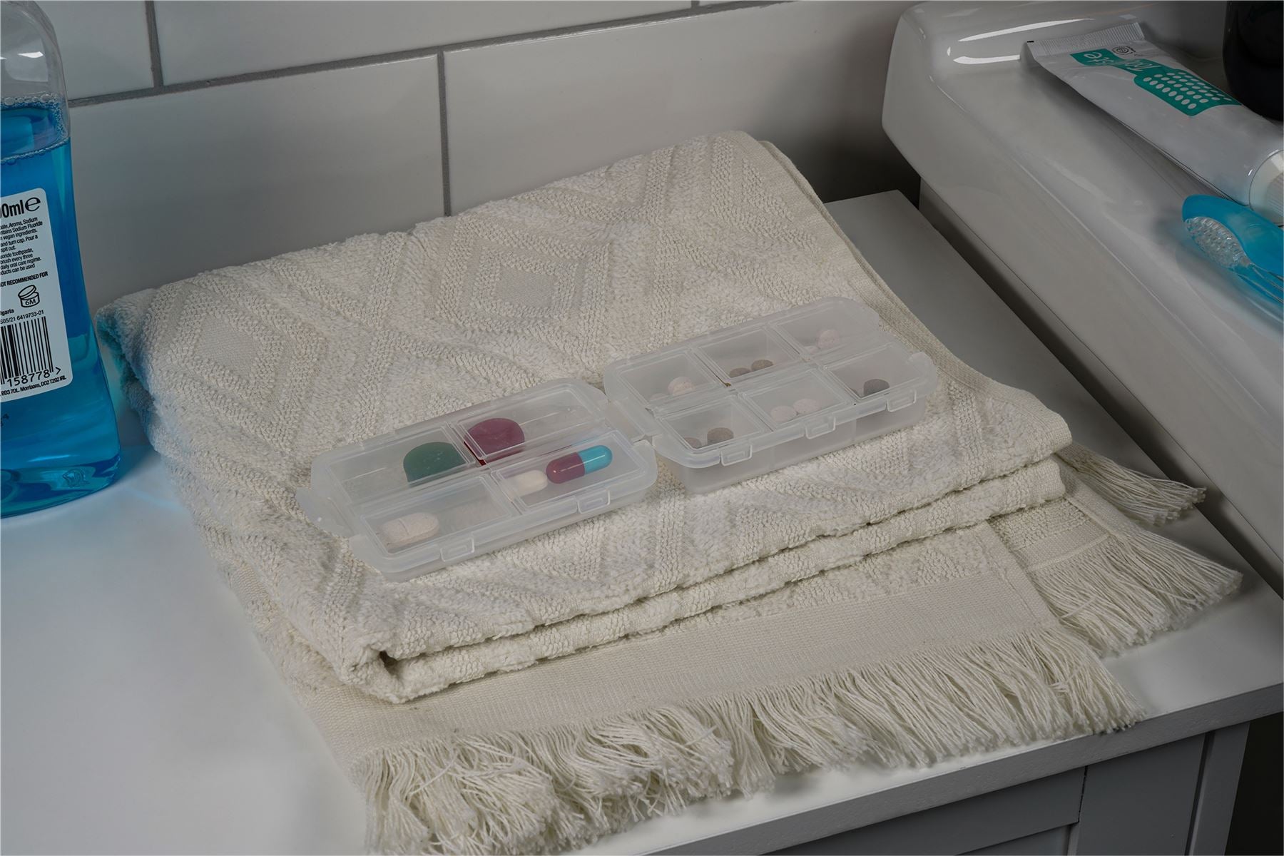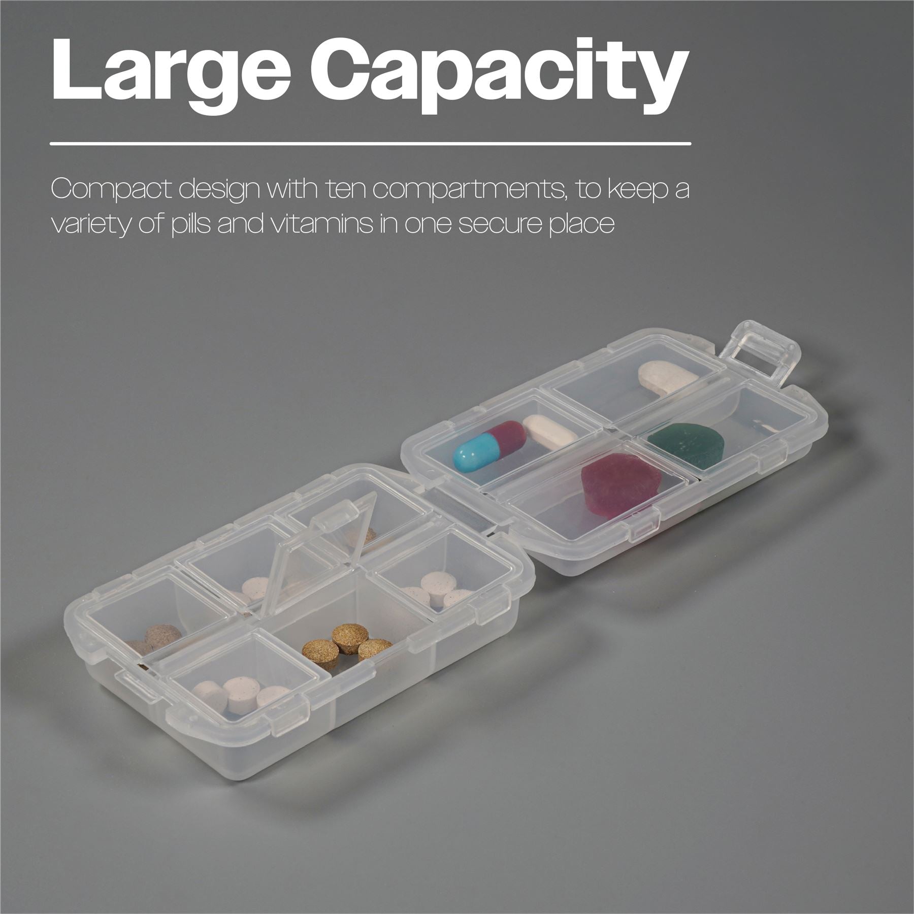 Compact 10 day pill storage case with 5 compartments per side. Clips together to close, take anywhere and keep your medication safe whilst travelling. Will hold multiple tablets of various sizes. BPA free.