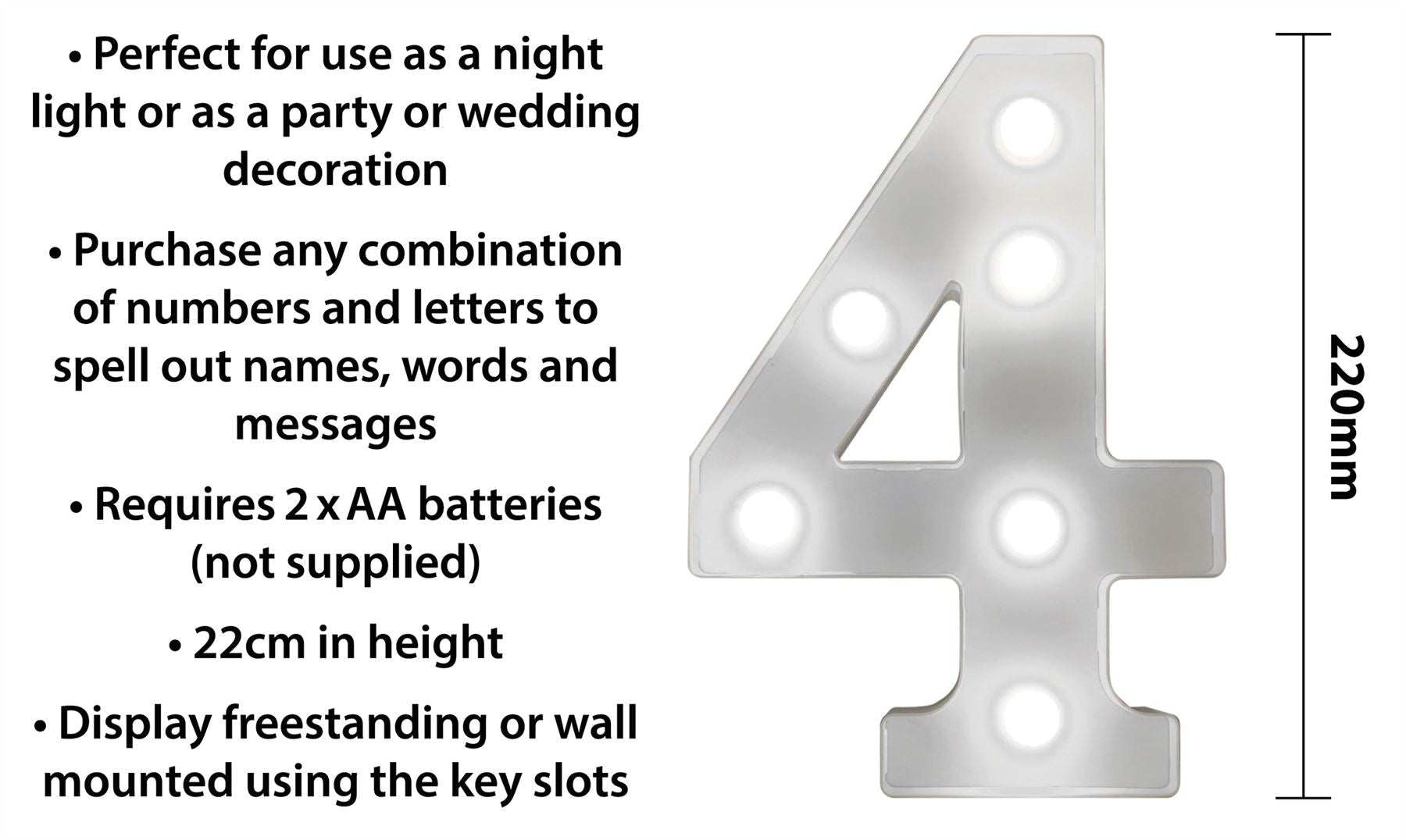 These battery operated 3D LED number lights are perfect for use as night lights or as party and wedding decorations. By purchasing a combination of numbers and letters you can spell out names, words and messages. The lights require 2x AA batteries (not supplied) and have an on/off switch. Each light can be displayed free standing or use the key slots in the back of the light to wall mount. When switched on the LED lights on the numbers create a warm and pleasing glow. Check out our range of 3D LED letters!