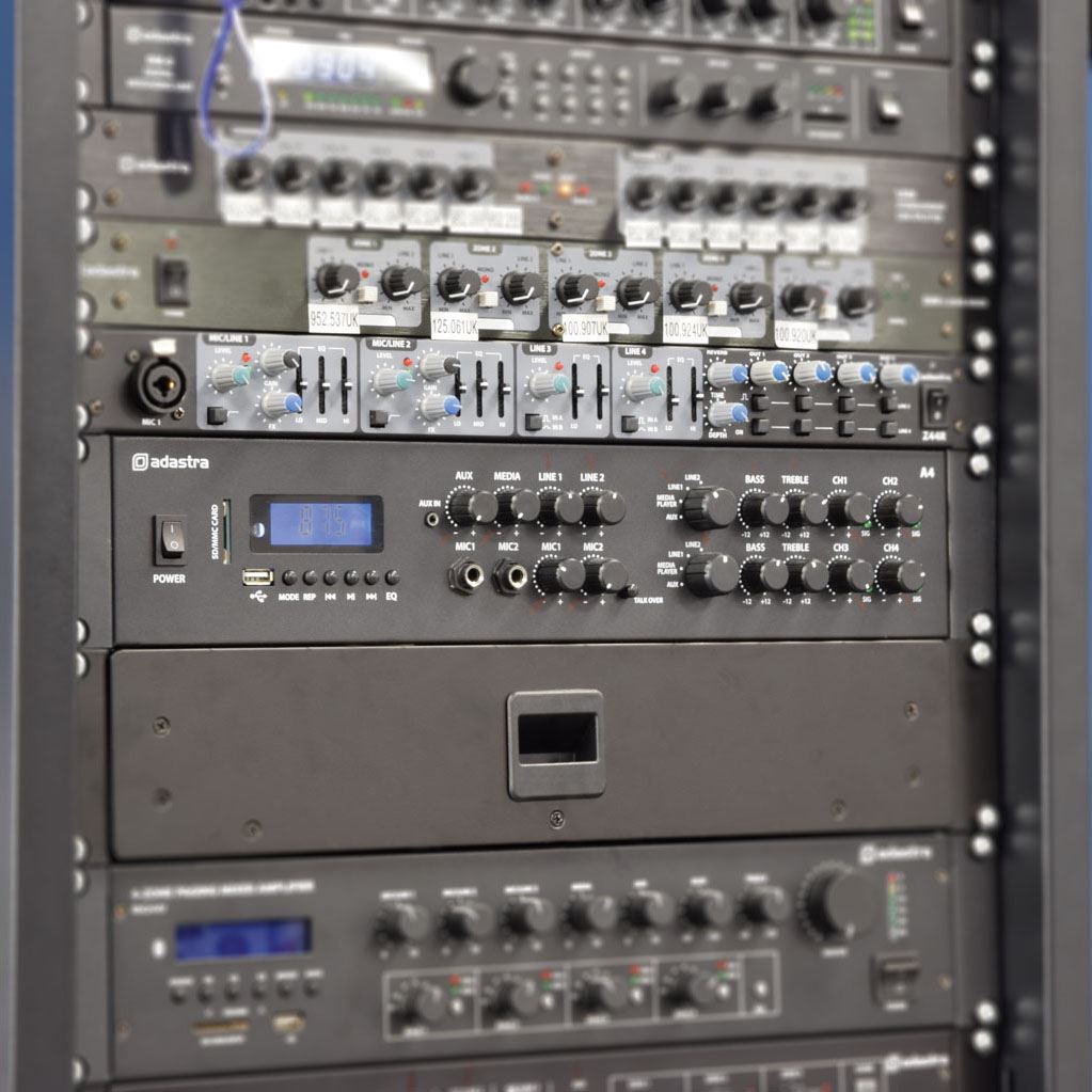 Fully featured PA amplifier with 2 independent stereo zone outputs.and mixer section for 2 microphones and a stereo audio source. An inbuilt media player section offers playback of mp3 audio tracks from USB drive or SD card and also has a Bluetooth receiver and FM radio tuner. A rotary switch for each output zone selects the stereo playback audio from a choice of 2 rear stereo inputs, a front 3.5mm stereo input or the built-in media player. Mic inputs 1 and 2 are live to both output zones at all times. 2 pairs of speaker connections on the rear panel are via 4mm binding posts, which can drive up to 2 x 8 Ohm speakers on each of the 4 channels to deliver up to 4 x 200W. Designed to offer installers a comprehensive dual zone PA for bars, restaurants and function rooms.