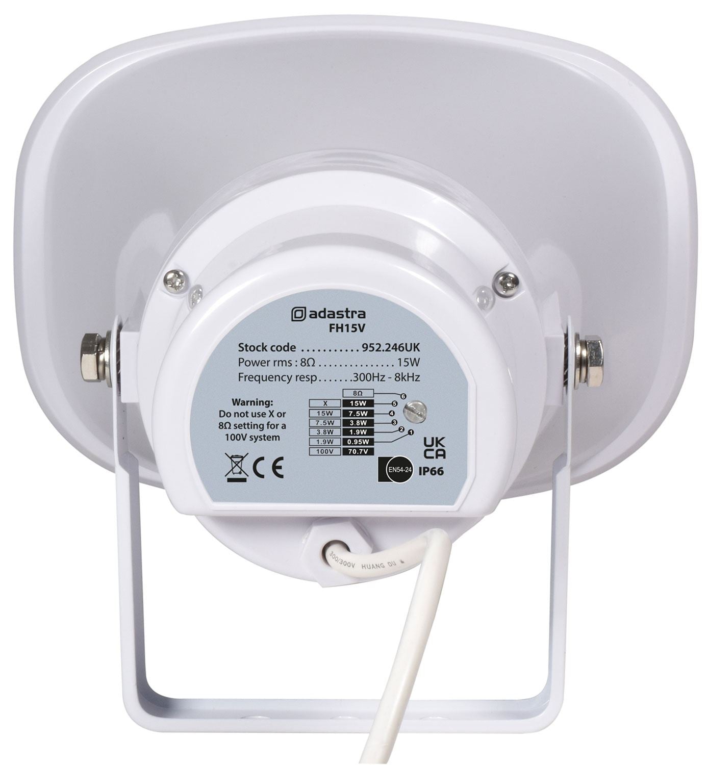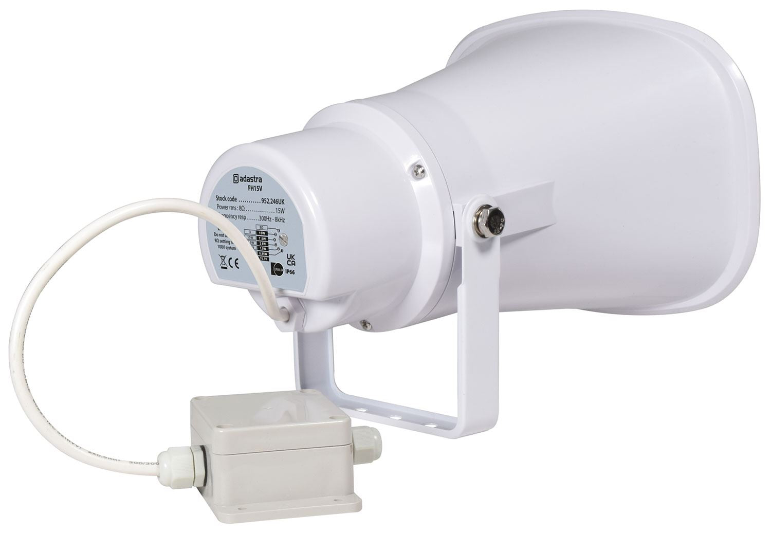 Moulded ABS weatherproof horn speakers with EN54-24 fire rating. Low impedance (8 Ohm) or 100V operation with switchable volume tappings (70V settings also included). Hard-wired with a fire-resistant cable and junction box, fitted with a ceramic screw terminal block and thermal fuse. Surface mounting via a stainless adjustable U-bracket. Designed for voice announcements and alerts in commercial PA installations.