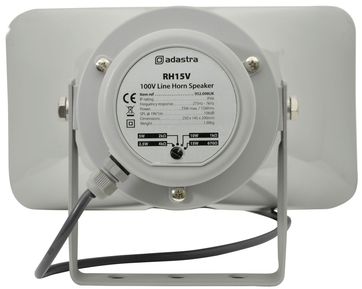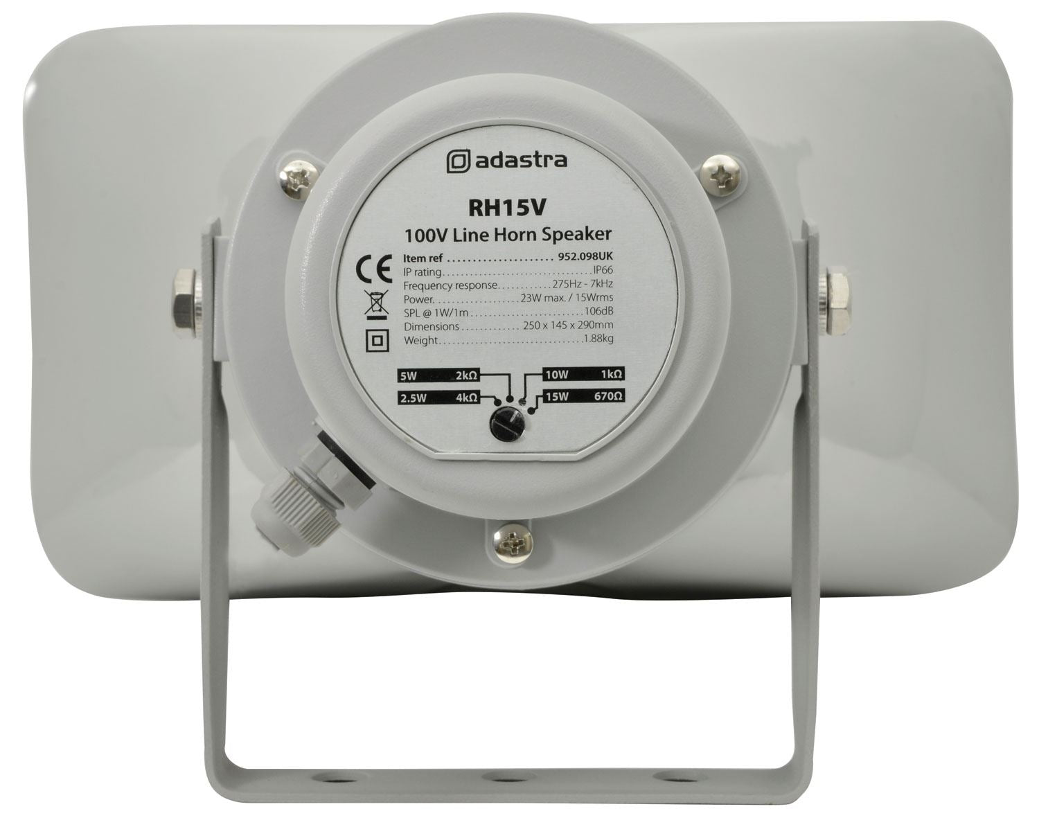 PA horn speakers with 100V transformer offering several different power settings. The housing is moulded from high impact ABS material to offer maximum protection against physical or weather damage. Reflex loading and a rectangular flared aperture ensures efficient and directed sound delivery over large areas.