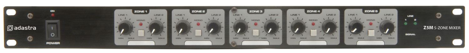 2 input, 5 zone mixer with individual volumes for both inputs and a mono switch for each zone.