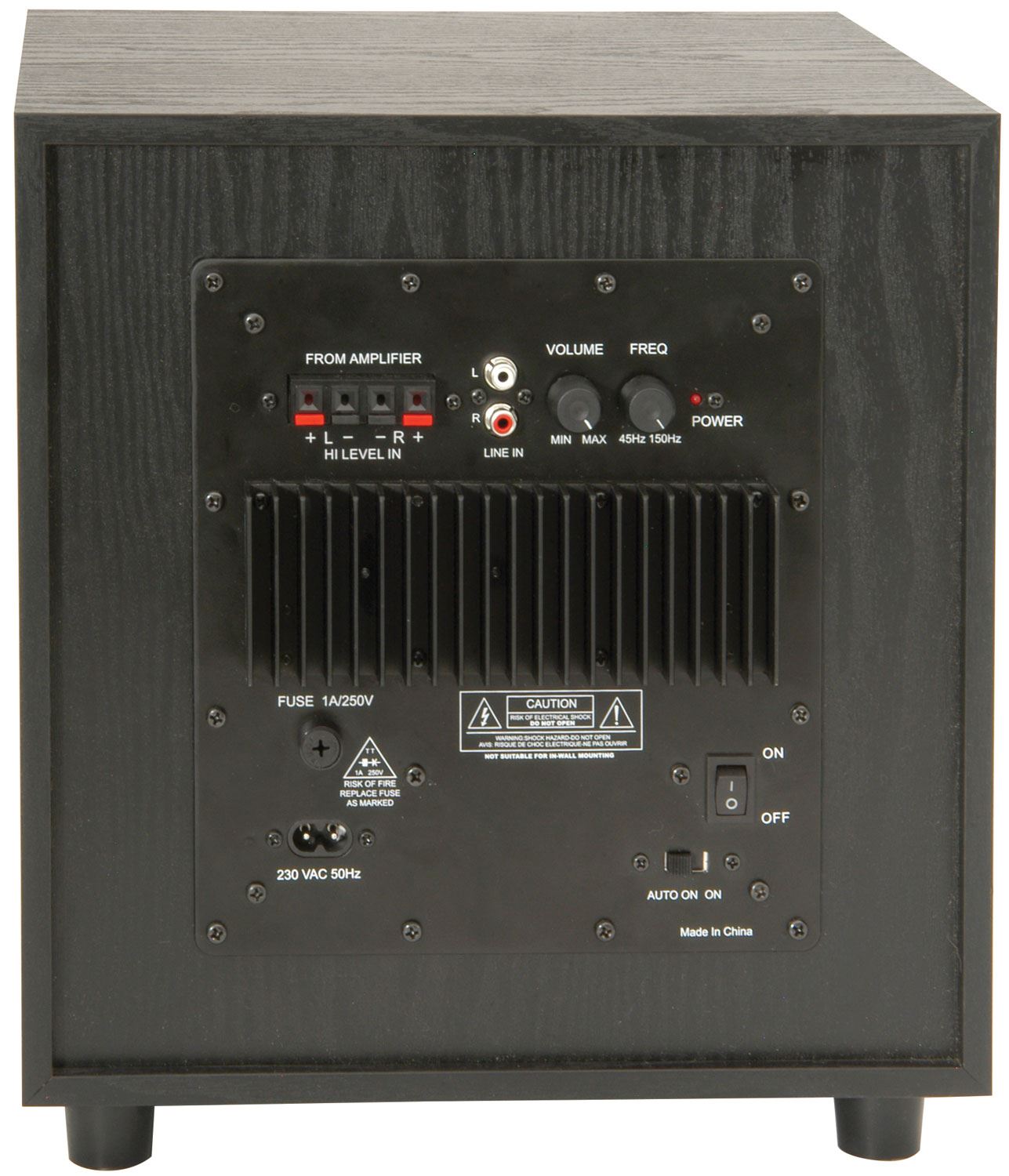 Power supply 220-250Vac, 50/60Hz (Fig 8)Driver 20cm (8") reinforced coneConnections Speaker level input terminals, RCA line level inRated output power 100WPeak output 200WFrequency response 50 - 250HzDimensions 300 x 330 x 300mmWeight 7.44kg