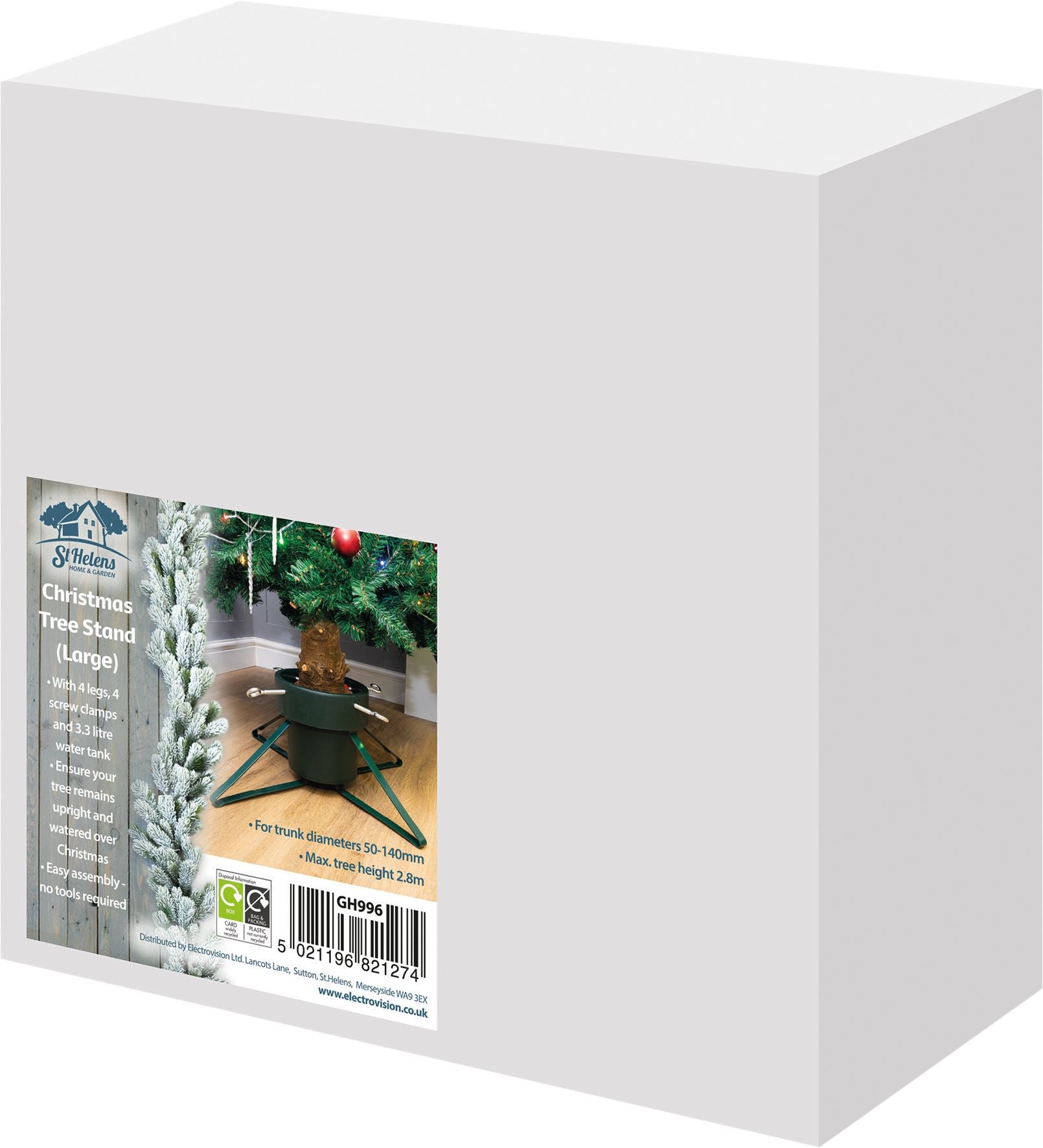 Ensure that your Christmas tree stays upright, secure and watered with the Christmas tree stand from St Helens Home Garden. Each stand has 4 metal legs to ensure stability, 4 screw clamps to secure the tree into place and a plastic water tank to keep your tree fresh, healthy and watered for the entirety of the Christmas period. Extremely quick assembly, no tools required. Can be used year after year.