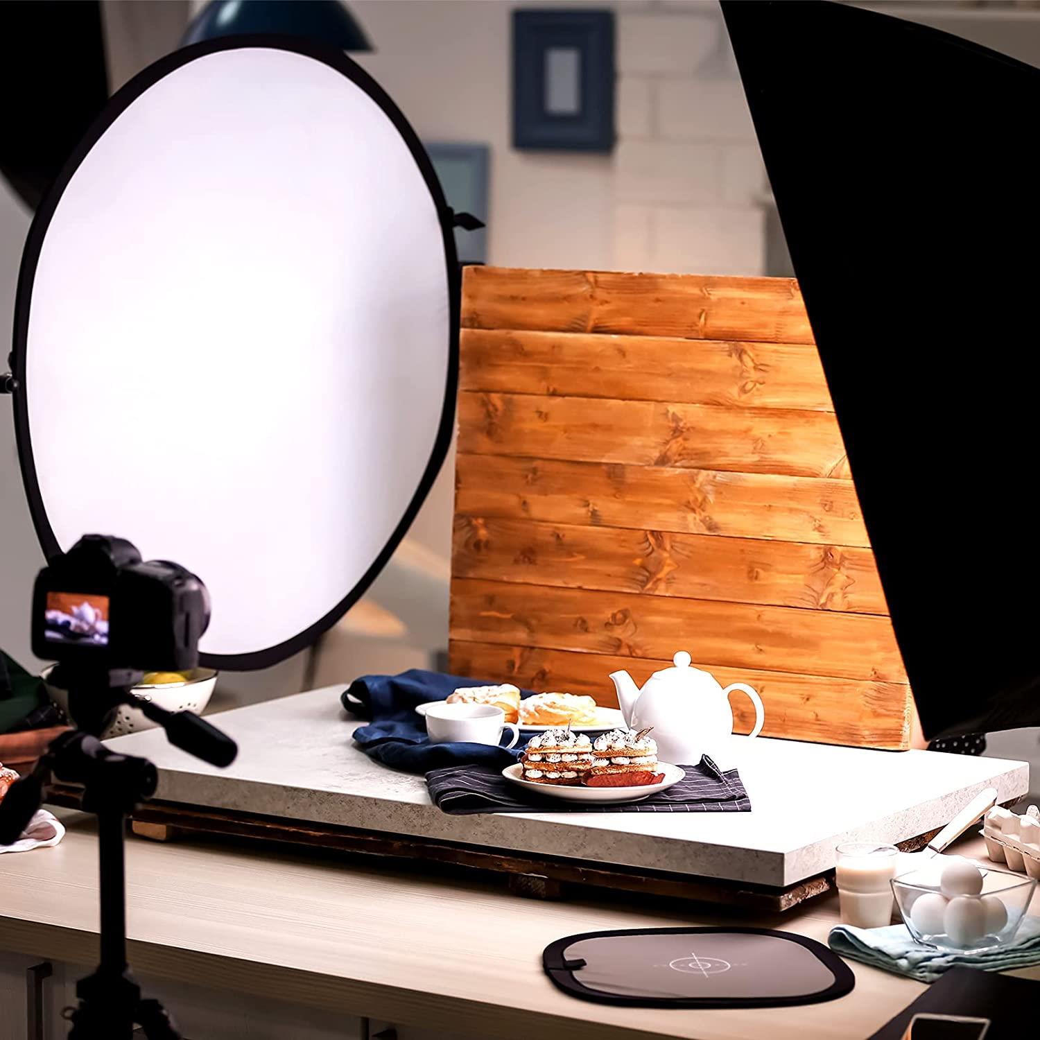 Translucent fabric is used to diffuse light, producing a broad light source and a soft, wraparound effect that's perfect for outdoor portraits or whenever a softer light is needed. Black stops sun or window light and prevents unwanted shadows. Green and Blue provide an excellent opportunity for editing purposes both on Photographic and in the particular video where a "Green Screen or Blue Screen" effect is required to edit the image to an alternative background later. Ex-Pro 7 in 1 Collapsible reflector.