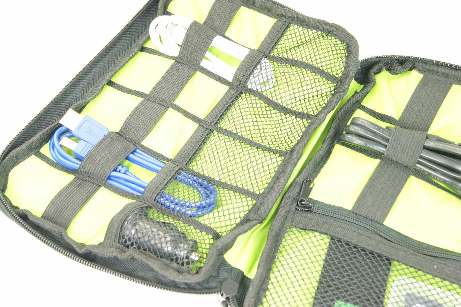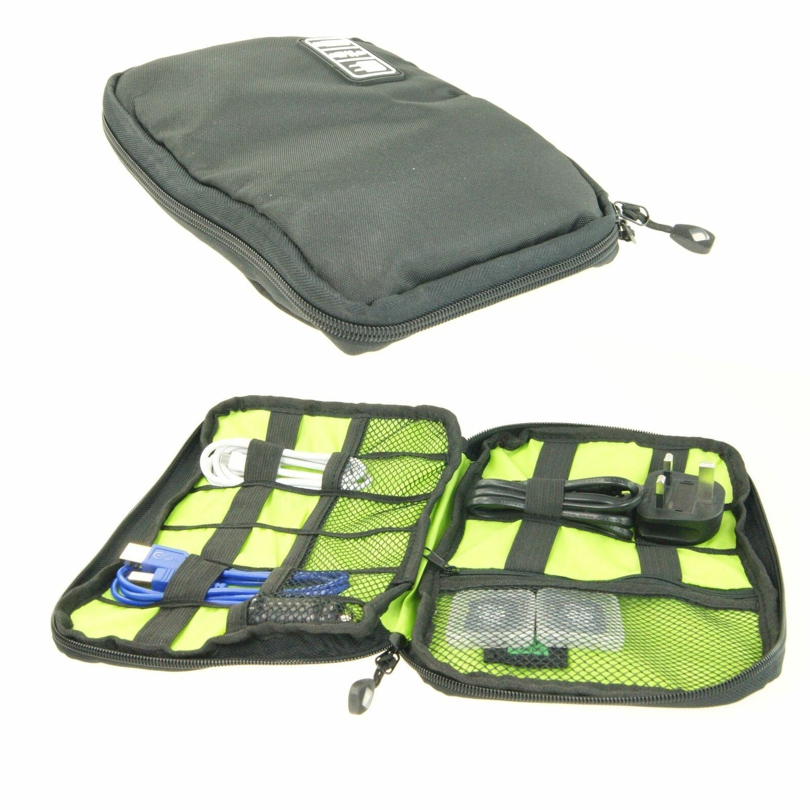 Ex-ProZip Up Cable Organiser. Simple neat sized cable orgainser ideal for stroring loose cable, small widgets instead of them been all over your bag, case or drawer ! Simple but very effective the case is manufactured from Nylon with dual zippers for fast easy access to content and is ideal for a multitude of devices, cable and gadgets. Case has 6 elestic loops to tthe left hand for small USB type cables and 6 mini mesh pockets (Ideal for USB Pens etc..). To the right side there are 4 further elastic dual loops for slightly bigger cables and a larger zipped mesh pocket for other gadgets (This mesh pocket as a built in velcro SD Card holder which neatly holds a single SD card safely.SpecificationsSizing 160mm x 220mm x 36mm.Dual Zippers.Nylon manufacture.Easy access.Tag and keep your kit organised with ease.