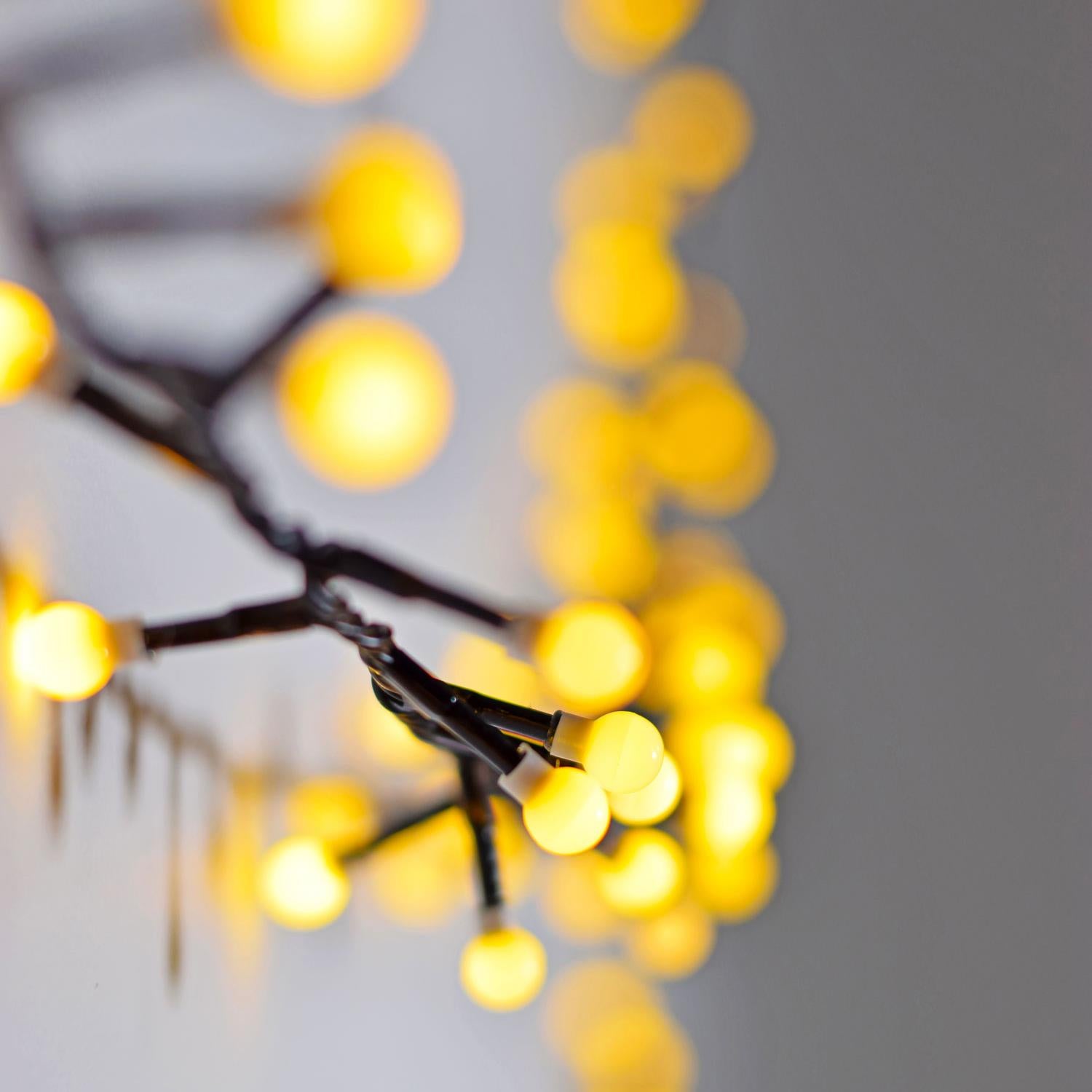 500 mini Berry Lights in warm white with an 8-programme controller to select your desired light sequence. These lights feature a timer function, allowing the lights to illuminate for 6 hours and switch off for 18 hours. These Berry Lights have a 3m power lead and are IP44 rated so can be used indoors and in outdoor covered areas.