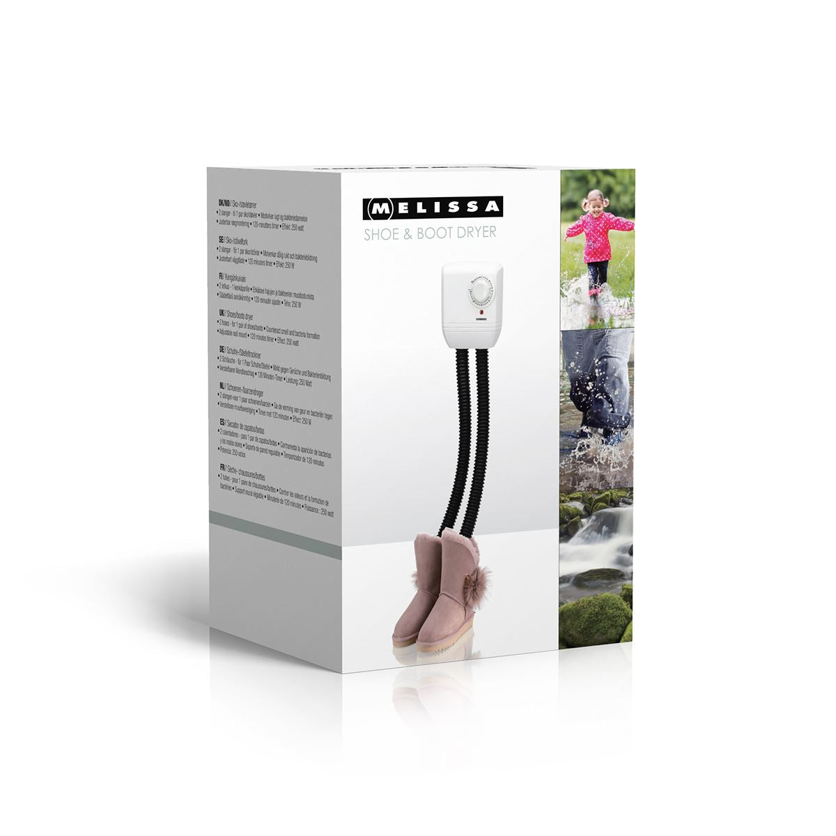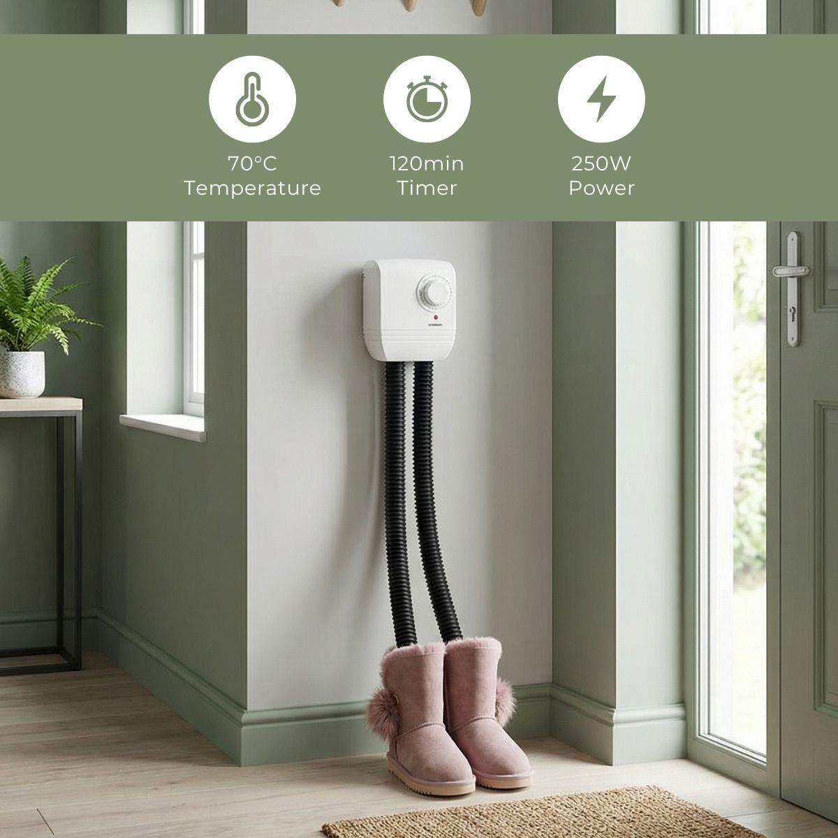 This shoe dryer, the Melissa 16540009, offers a highly effective solution for drying shoes and boots that have become wet inside. It's perfect for families with children or anyone who enjoys outdoor activities in all kinds of weather. Wet shoes can take an excessively long time to air dry and are prone to developing odors and bacteria. Fortunately, this issue can be easily mitigated with our shoe dryer. It rapidly eliminates moisture, ensuring that your shoes are quickly ready for use again. This 250W shoe dryer can accommodate one pair of shoes or boots and is incredibly user-friendly. The adjustable wall mount means it can be conveniently hung up, keeping it within easy reach whenever required. The hoses are flexible and adjustable, fitting comfortably into both shoes and boots. Simply place a hose in each shoe or boot, set the timer to your desired duration, and the machine begins its work. It automatically shuts off after the set time, and a thermal fuse is installed to prevent overheating.