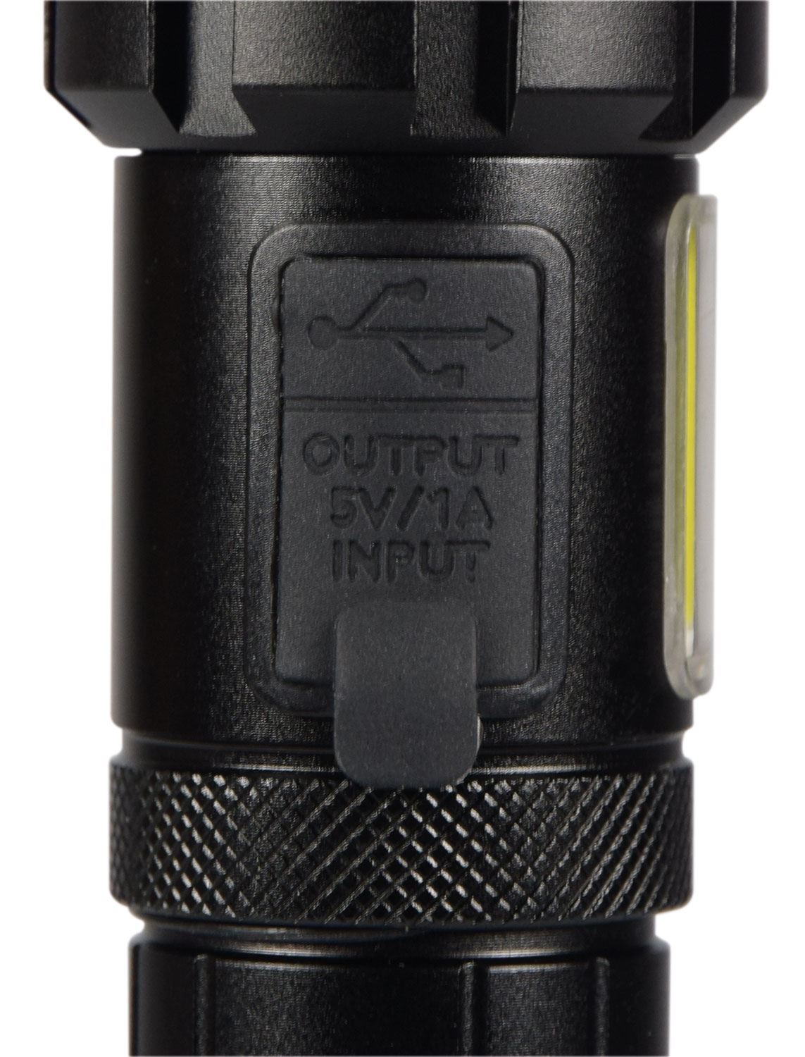 Rugged metal bodied, super bright USB Rechargeable COB LED Flashlight with 7 lighting modes. Useful for hiking, camping, or keeping in a car, this flashlight will give you up to 8 hours use on a single charge. Featuring a main beam and side lamp that can act as a work light or emergency warning light. Can also be used as an emergency powerbank via the 5000mAh battery and USB A port
