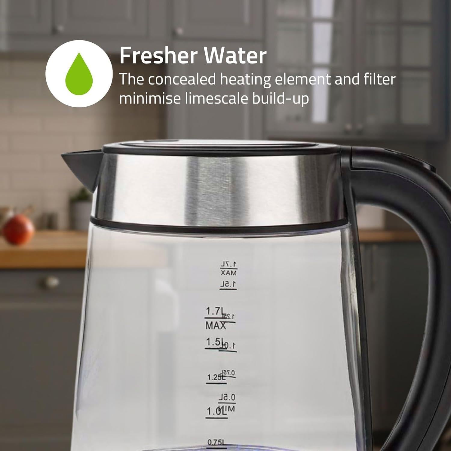 Blue LED light shows the kettle is in use and with a glass housing you can actually see when the water is boiling. The cordless 360° pirouette base ensures an easy lift. The concealed heating element minimizes limescale build-up and together with the removable filter, this kettle is super easy to clean, ensuring a consistent great taste of your hot drinks.