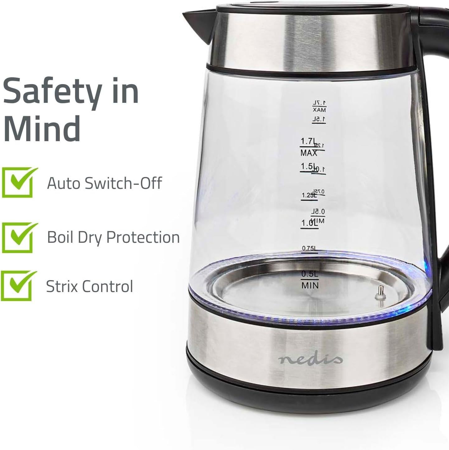Our stylish, powerful Nedis electric kettle works just as good as it looks: it has a generous 1.7 litre capacity. Thanks to a powerful performance of 2200 W, you’ll have your tea ready in no time.