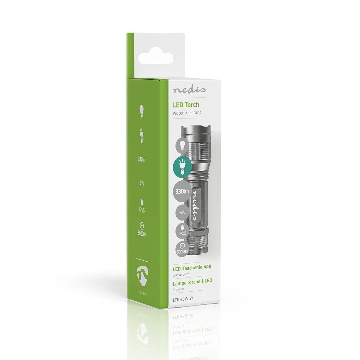 Compact yet powerful 5-W torch to light areas up to 200 metres with 330 lumen. It is equipped with a rotatable head to focus the light beam and features an IPX5 water resistant protection and an anodised, aluminium body which provides extreme durability.
