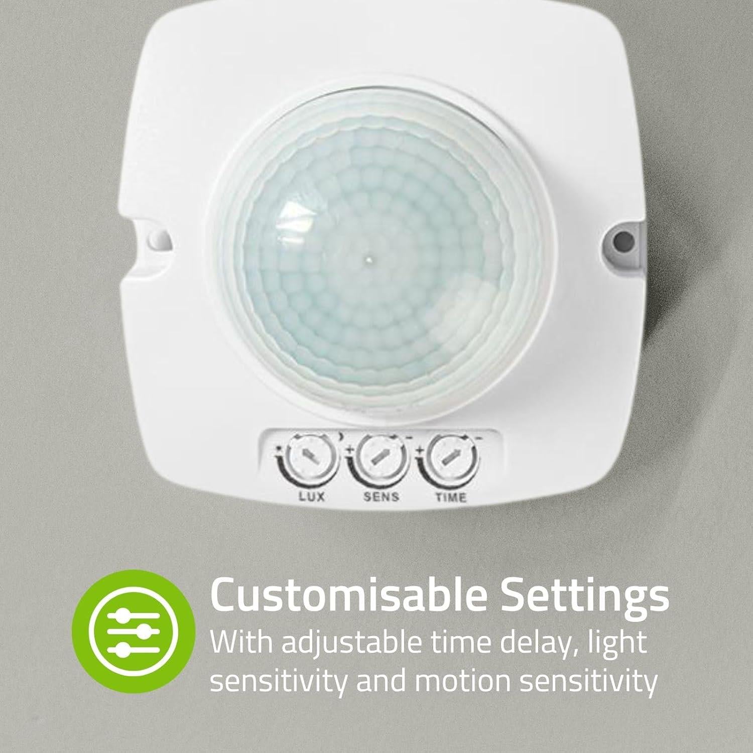 The sensor has adjustable time delay and light sensitivity settings and is equipped with adjustable motion sensitivity.
