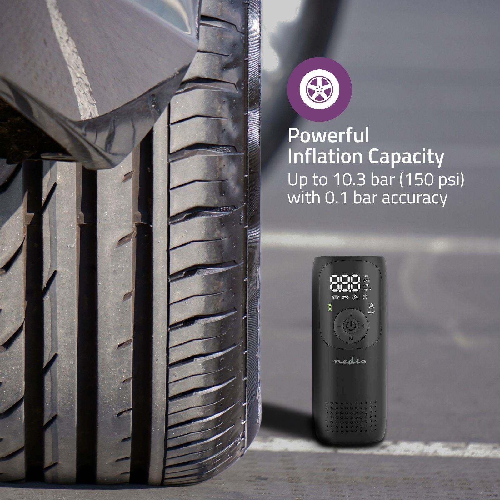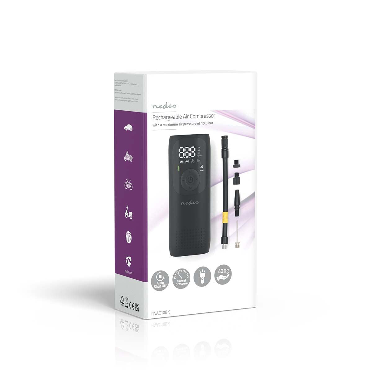 Discover the ultimate convenience with the Nedis Rechargeable Air Compressor. This cordless portable air pump eliminates the hassle of traditional air compressors, offering seamless operation for all your inflation needs. Versatile and efficient, it effortlessly fits the most common tyre valve types and is also ideal for inflating balls, swimming rings, and more.