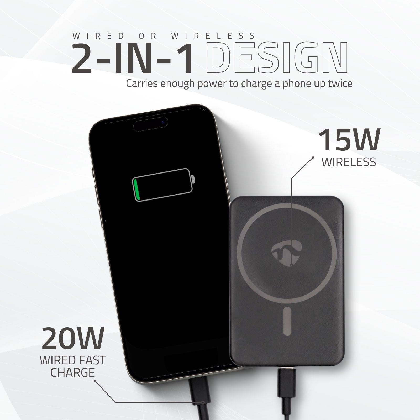 With its innovative design, this powerbank offers seamless charging for your phone, both with and without a cable, thanks to its 2-in-1 functionality. Experience the convenience of magnetic connection, compatible with MagSafe, enabling wireless charging at up to 15 Watts.