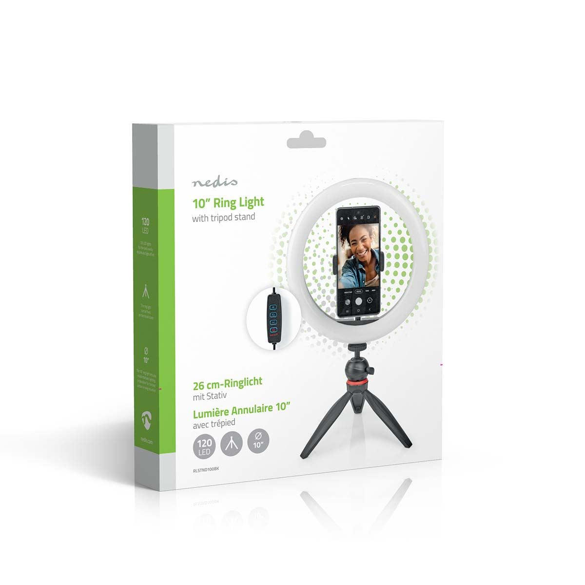 With this Nedis ring light on a tripod you always have the best lighting for your selfies, vlogs, tutorials, TikTok, Instagram or You Tube videos. The 10" ring lamp with 120 LEDs ensures the best evenly distributed light effect ensures so you always look at your best. Just put the right light on the table, attach your smartphone and you can start filming.