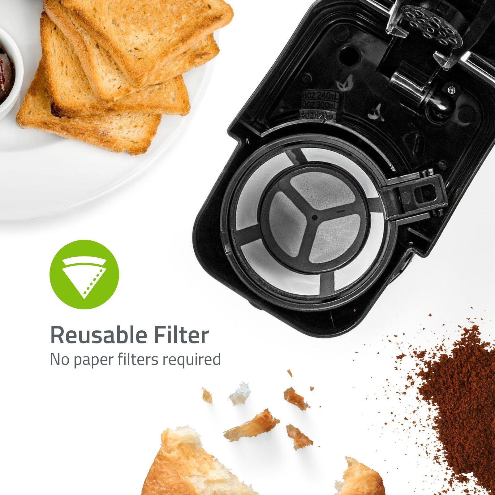 Each round serves enough coffee to fill up the included travel mug. You don’t waste time with pouring coffee from regular cups or coffee jug into your on-the-go mug, minimising the dishes as well.