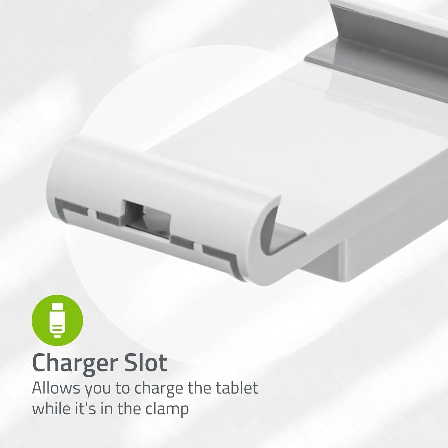 • A slot in the tablet clamp allows charging the tablet while it's in the clamp
