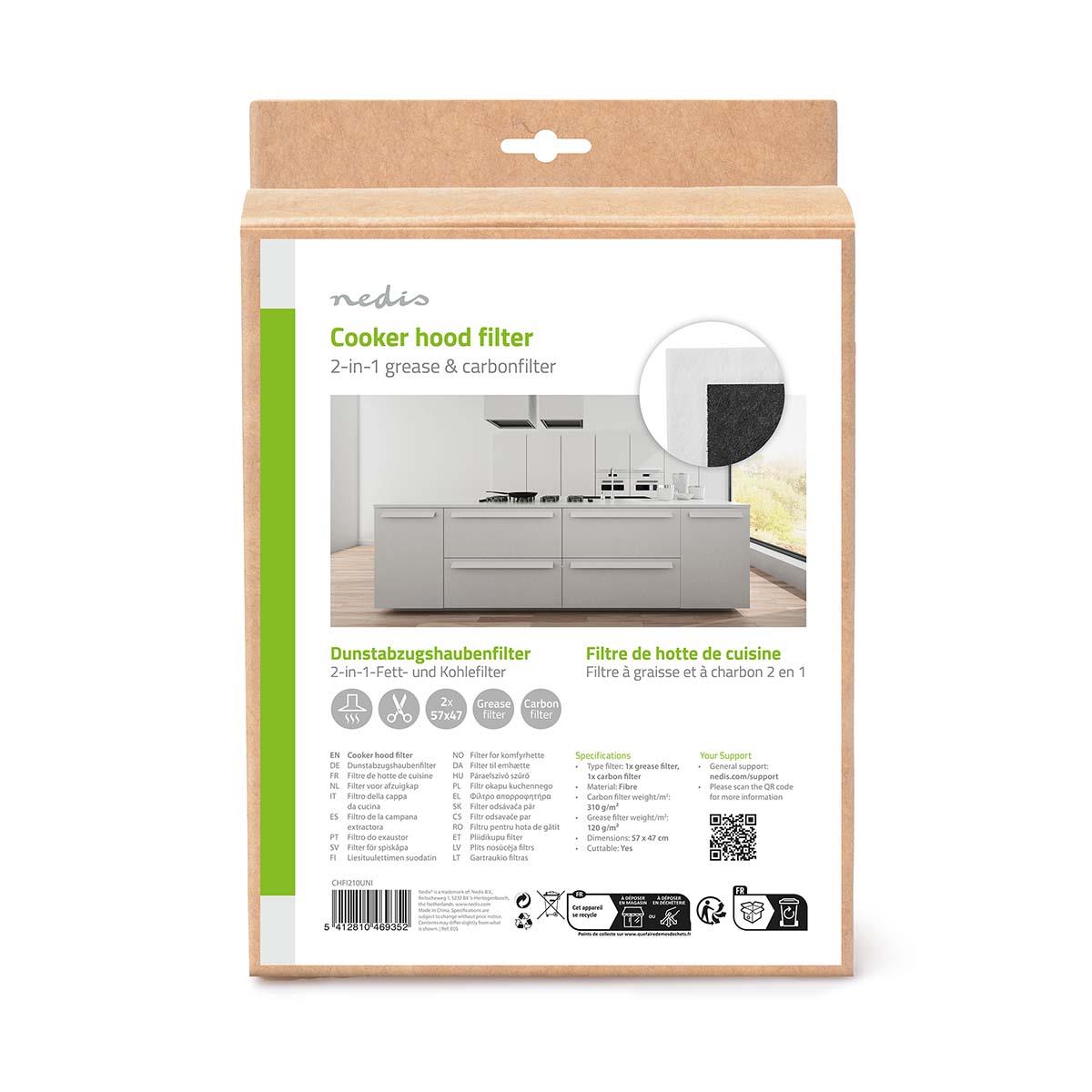 This universal 2-in-1 grease & carbon cooker hood filter absorbs grease and moisture while cooking, preventing unpleasant odours in the kitchen. The filter is self-extinguishing after no more than 10 seconds according to the standard V1.