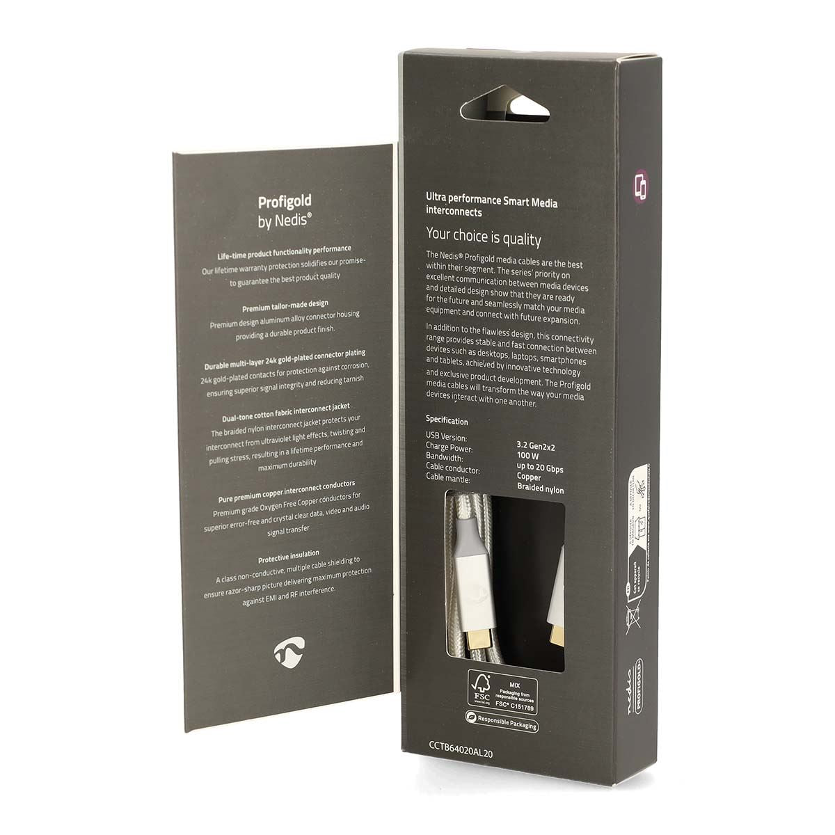 Nedis USB Cable | USB 3.2 Gen 2x2 | USB-C™ Male | USB-C™ Male | 100 W | 4K@60Hz | 20 Gbps | Gold Plated | 2.00 m | Round | Braided / Nylon | Silver | Cover Window Box