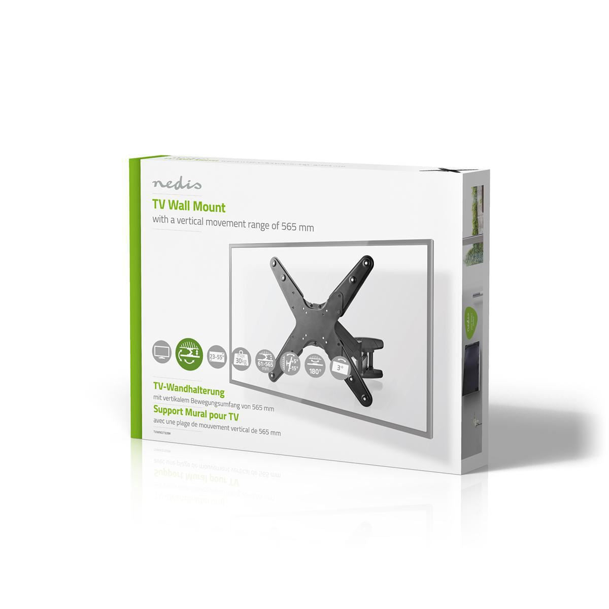 Its vertical design allows you to easily position your television at the perfect height. You can alter the distance from the wall between 61 mm and 565 mm, tilt the screen forwards between 5° and -15° to minimise glare, rotate the screen a complete 180° for the best viewing angle and swivel your TV set from +3° to -3° to level the screen according to lighting conditions.
