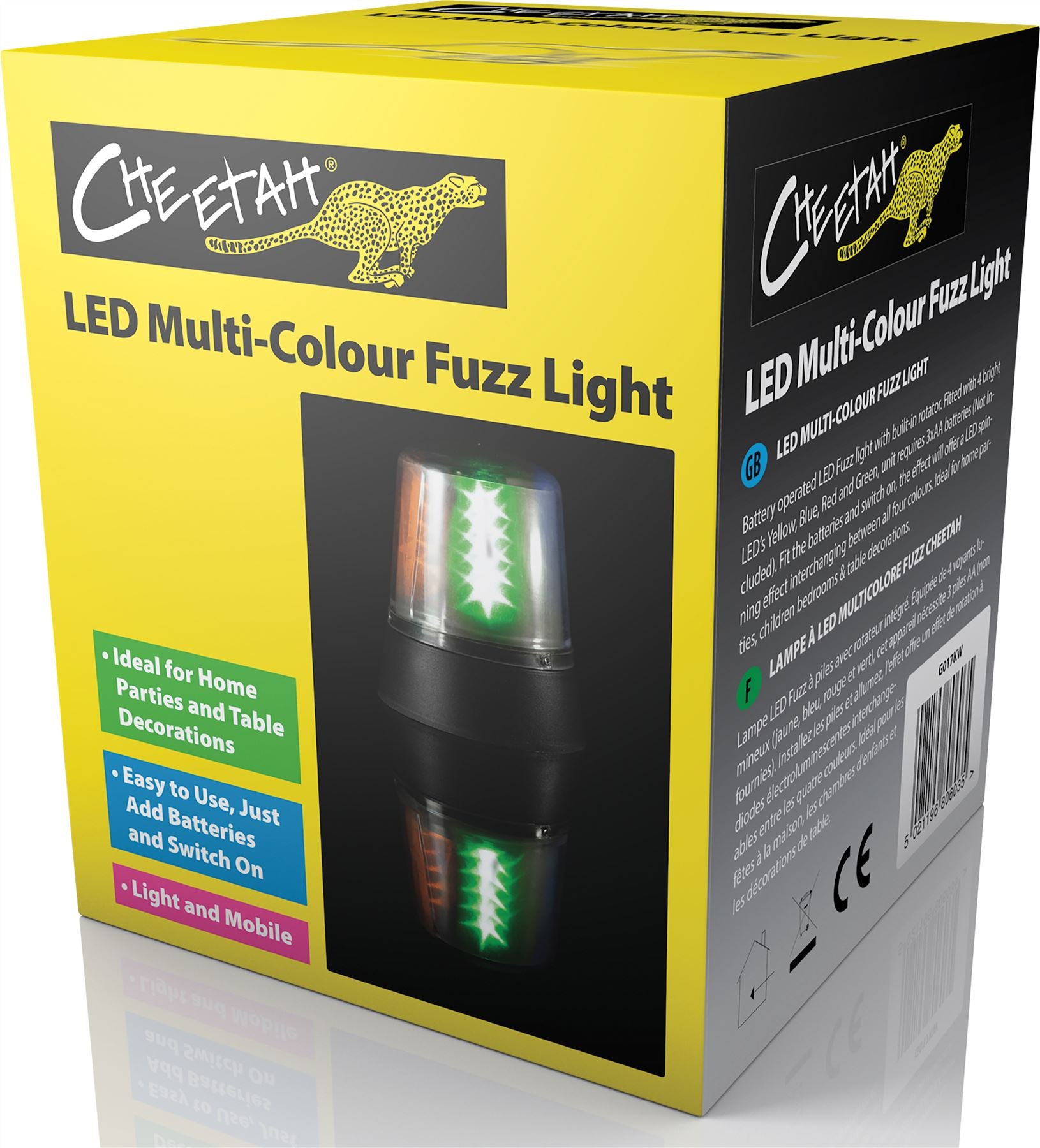 Battery operated LED Fuzz light with built-in rotator. The light is fitted with 4 bright LED s in Yellow, Blue, Red and Green, the unit requires 3xAA batteries (Not Included). Simply fit the batteries and switch on, an LED spinning effect is created interchanging between all four colours. The fuzz light is Ideal for parties and children s bedrooms etc.