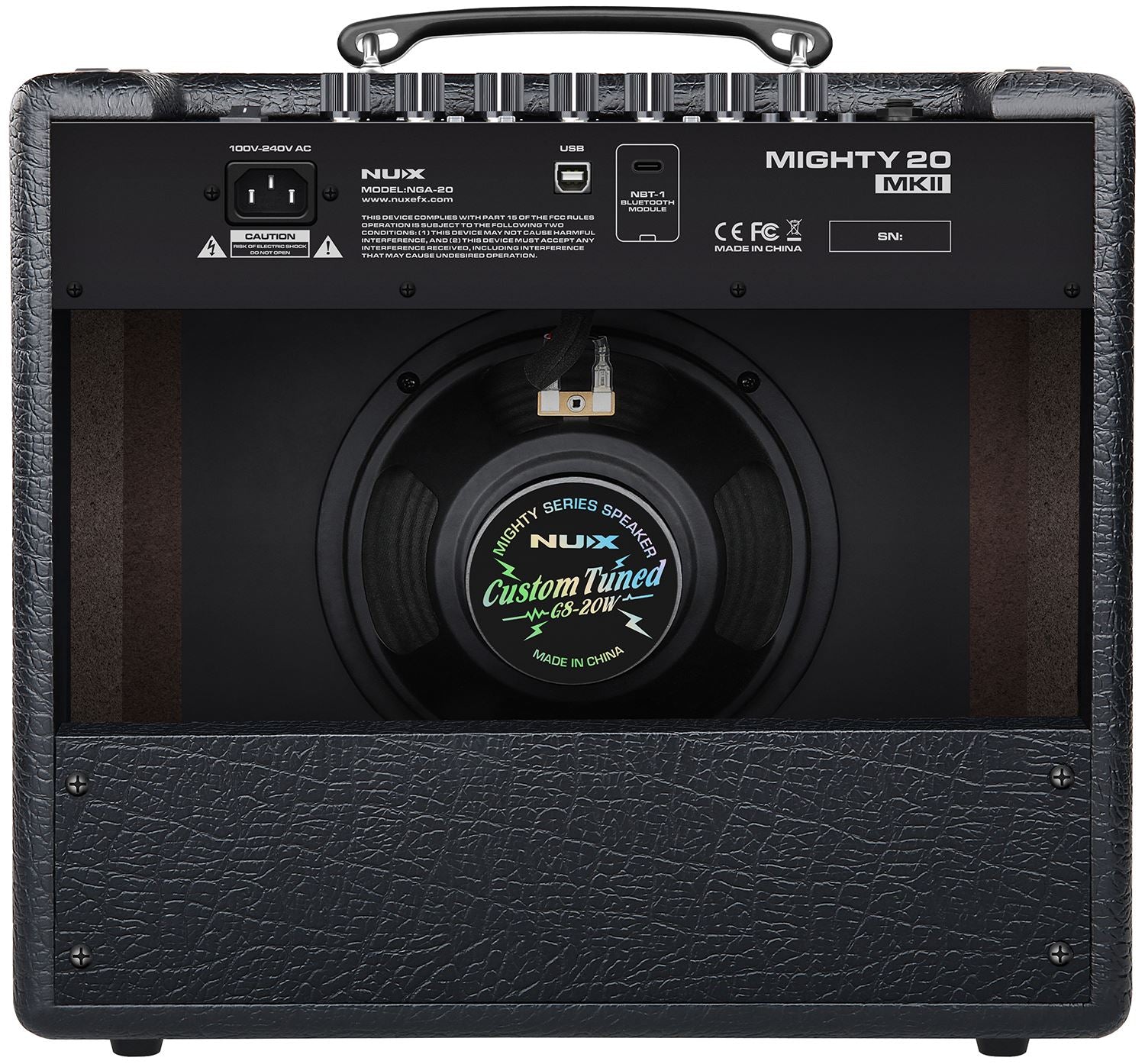 The Mighty 20 mkII is a complete rehearsal, live and recording amplifier and effects unit for guitarists. The 8" speaker is powered by a 20W amplifier section. Select through 7 channel presets that are fully editable with 8 freely moveable processing blocks including the proprietary TS/AC-HD amp modelling and IR cabinet simulation along with a myriad of gain, EQ and time-based effects to choose from. Each channel preset also has 3 pro scenes for quick switching between settings mid-song. Included with the Might 20 mkII is the NBT-1 Bluetooth adaptor, which can be connected at the rear to enable pairing with a smart phone for audio streaming and deep programming using the free-to-download Mighty Amp™ app for ios or Android. Editing from a laptop is easy via USB connection using the free Mighty Editor™ software and this connection also serves as a direct audio interface in a software recording environment. Add to this an internal 60 second phrase looper with auto tempo detection and inbuilt drum machine and the Mighty 20 mkII has everything that a player would need for practice, rehearsal and recording.