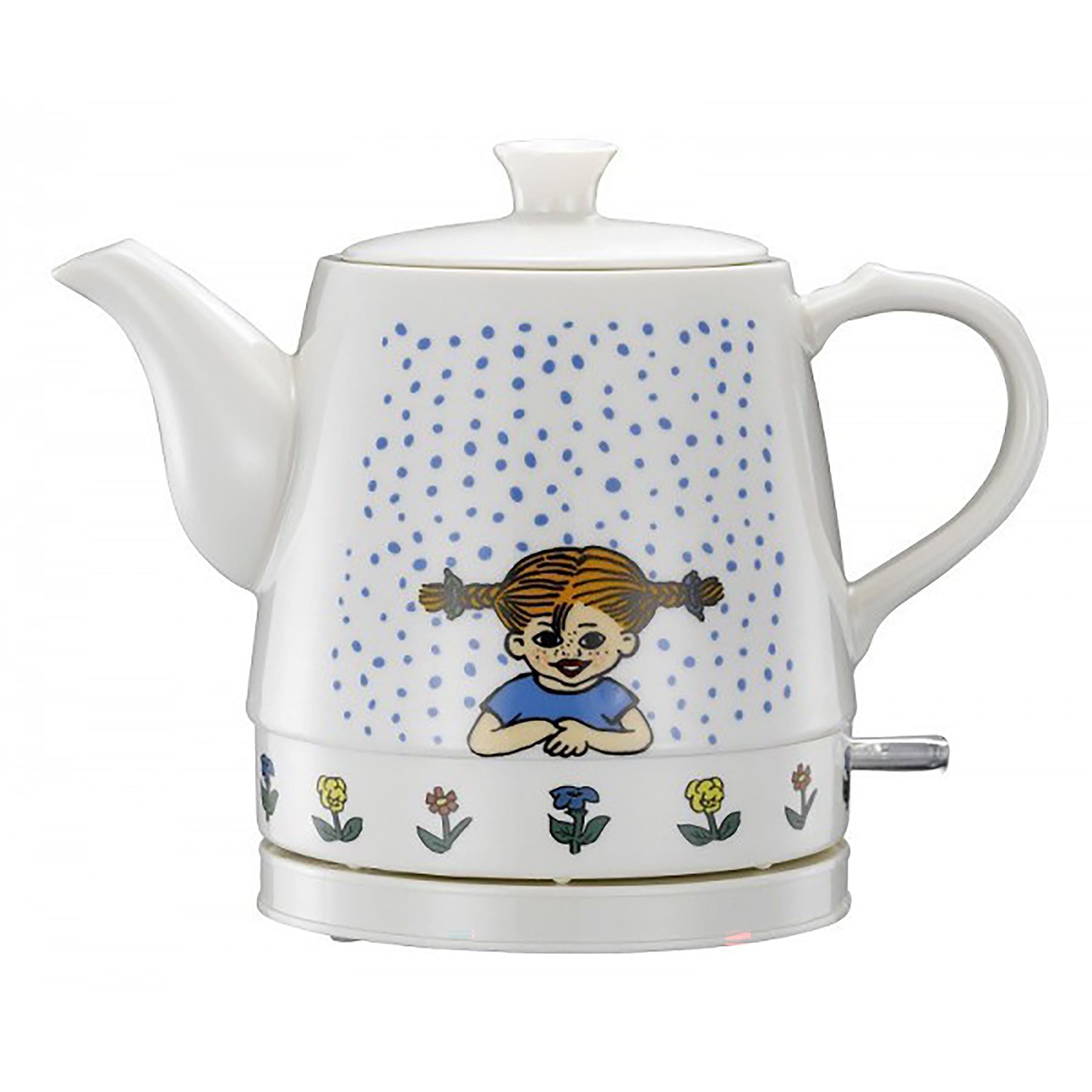 The white Pippi cordless electric kettle is made of ceramic and has a motive that triggers nostalgic thoughts.